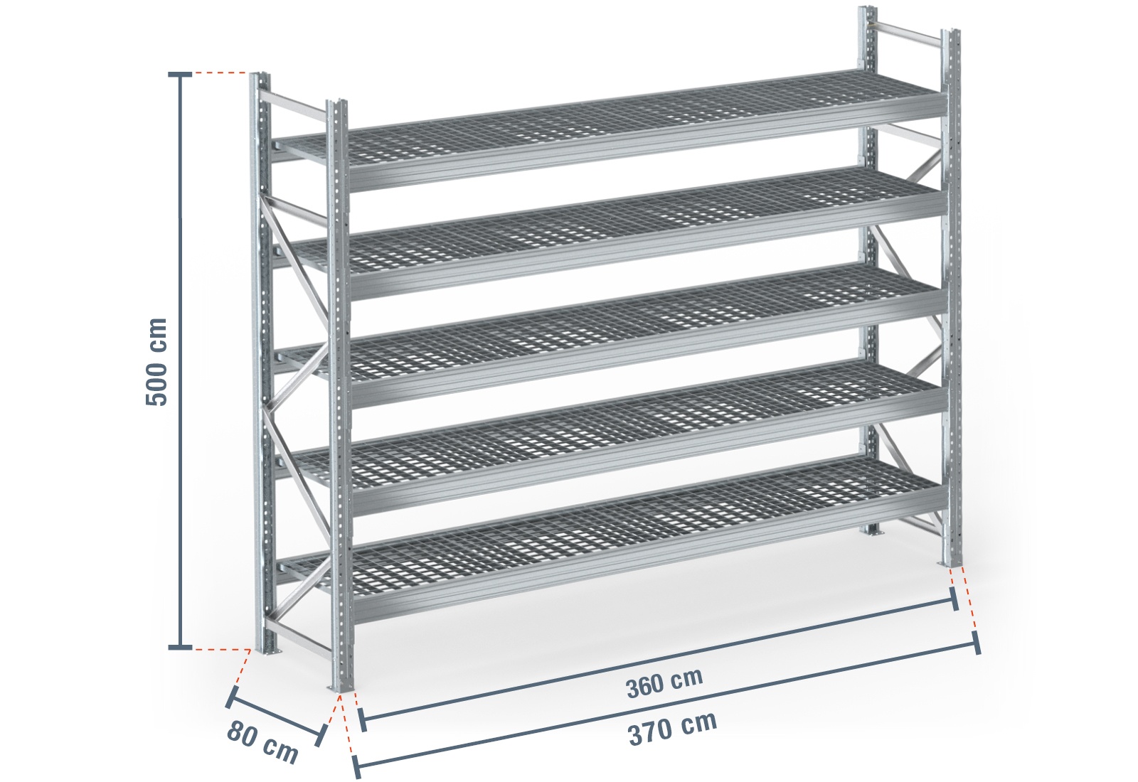 3,7 m pallet rack PR9000F galvanised / 80 cm deep / 5 m high / 5 levels / rack layer Galvanised mesh