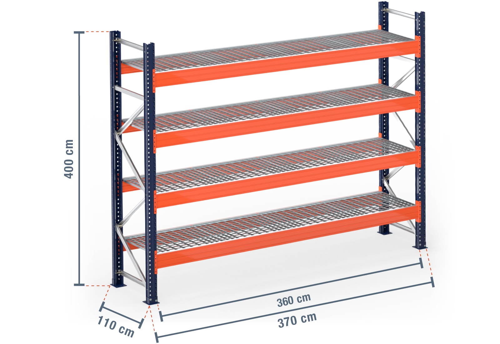 3,7 m pallet racking PR15000 / 110 cm deep / 4 m high / 4 levels / rack layer Galvanised mesh