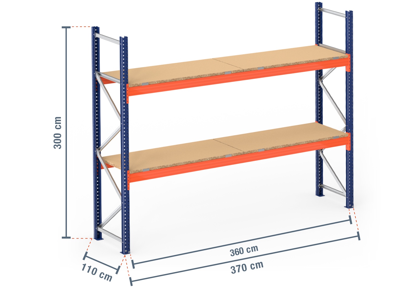 3,7 m pallet racking PR4500 / 110 cm deep / 3 m high / 2 levels / rack layer Wood