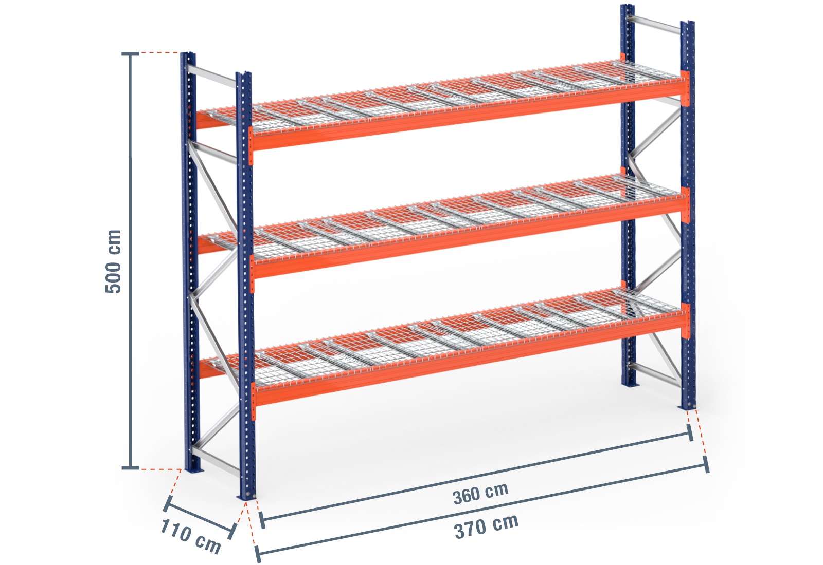 3,7 m pallet racking PR9000 / 110 cm deep / 5 m high / 3 levels / rack layer Wire mesh