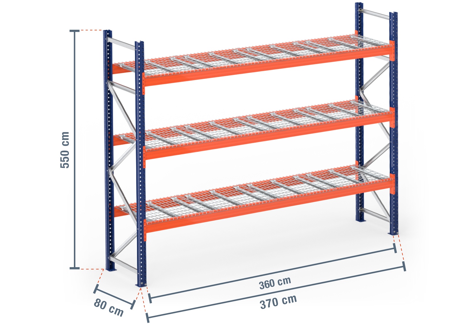 3,7 m pallet racking PR9000 / 80 cm deep / 5,5 m high / 3 levels / rack layer Wire mesh