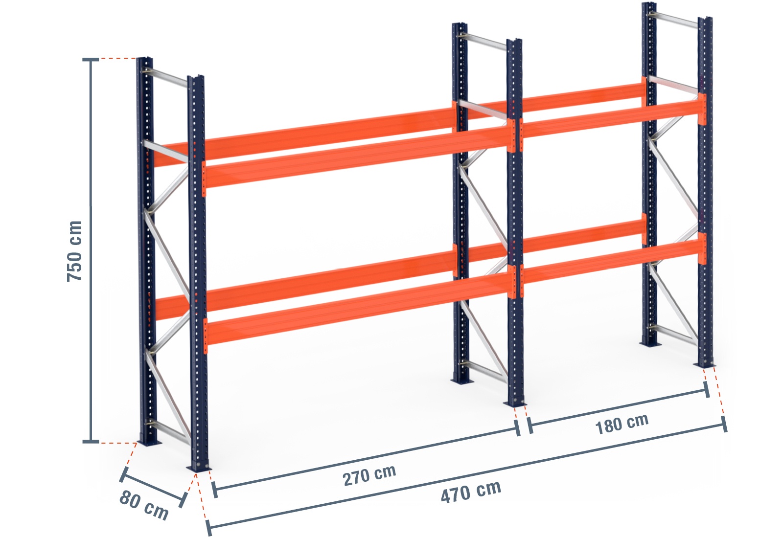 4,7 m pallet rack PR15000 / 80 cm deep / 7,5 m high / 2 levels for 15 euro pallets