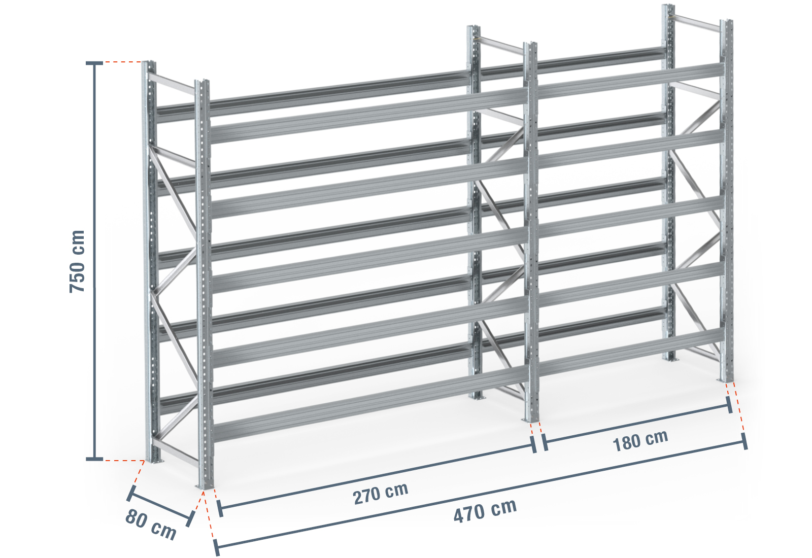 4,7 m pallet rack PR9000F galvanised / 80 cm deep / 7,5 m high / 5 levels for 30 euro pallets