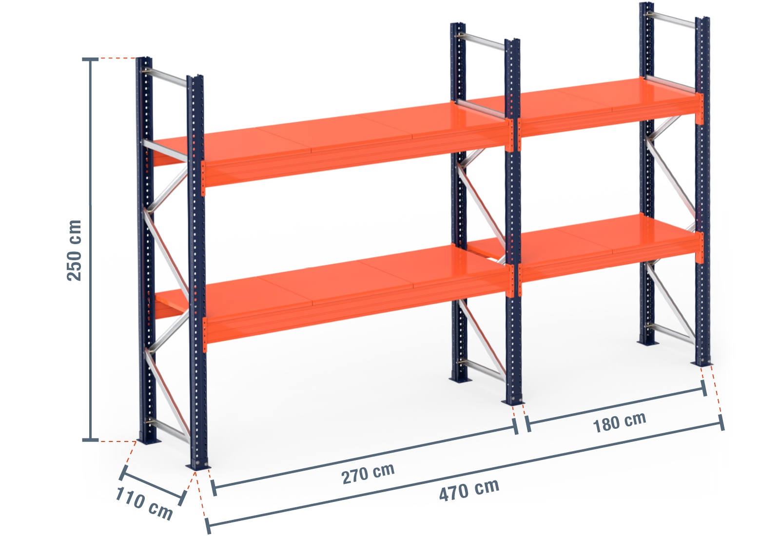 4,7 m pallet racking PR15000 / 110 cm deep / 2,5 m high / 2 levels / rack layer Steel