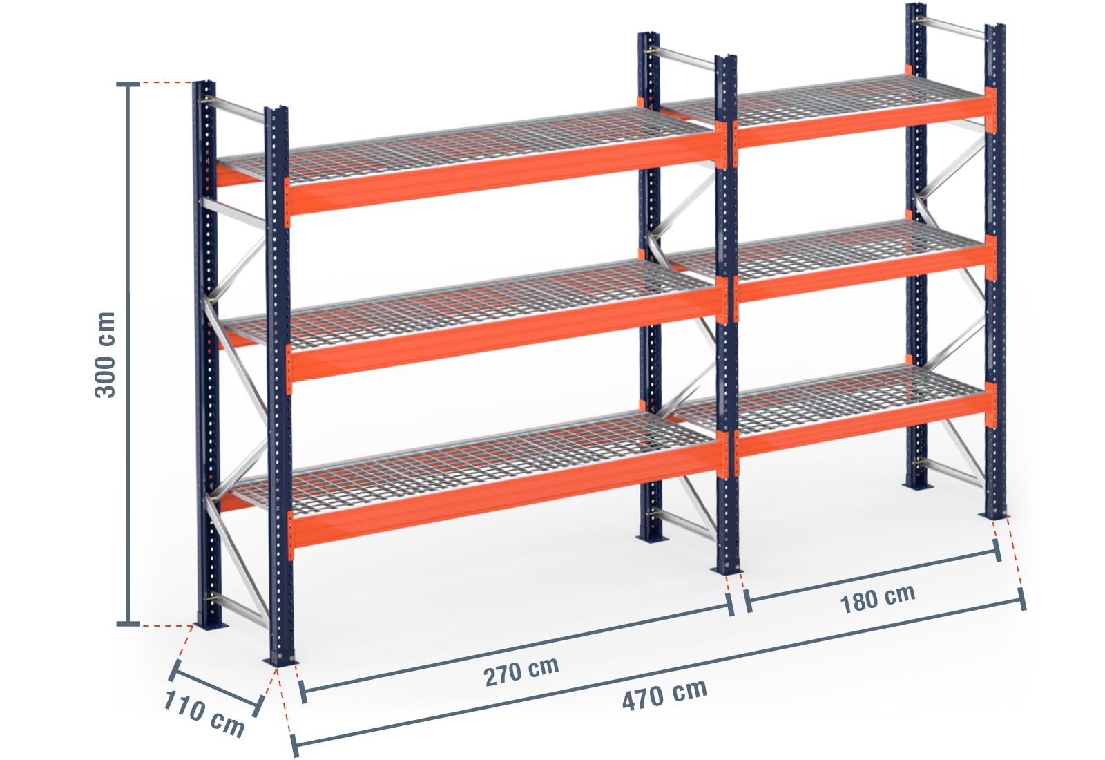 4,7 m pallet racking PR15000 / 110 cm deep / 3 m high / 3 levels / rack layer Galvanised mesh
