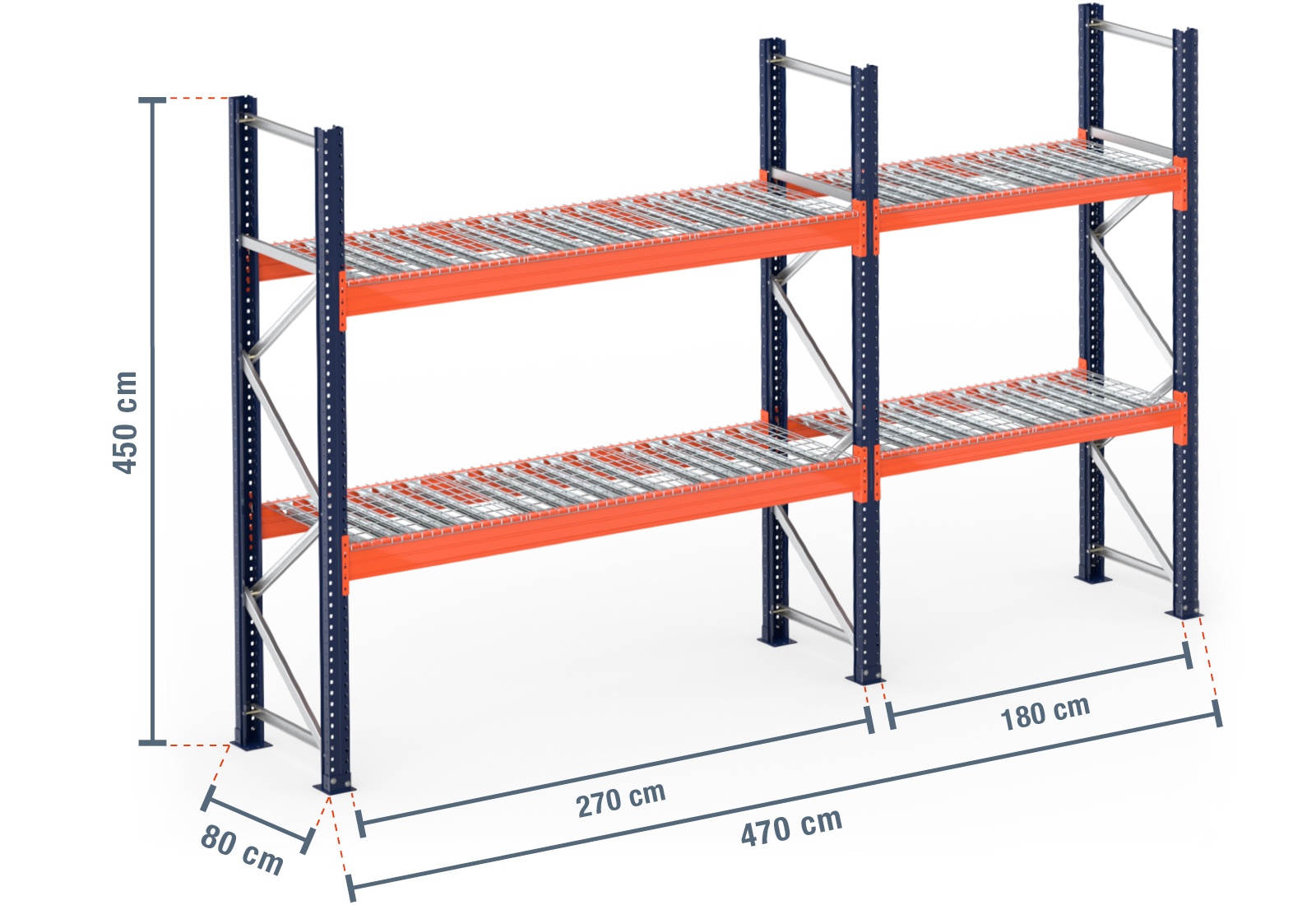 4,7 m pallet racking PR15000 / 80 cm deep / 4,5 m high / 2 levels / rack layer Wire mesh