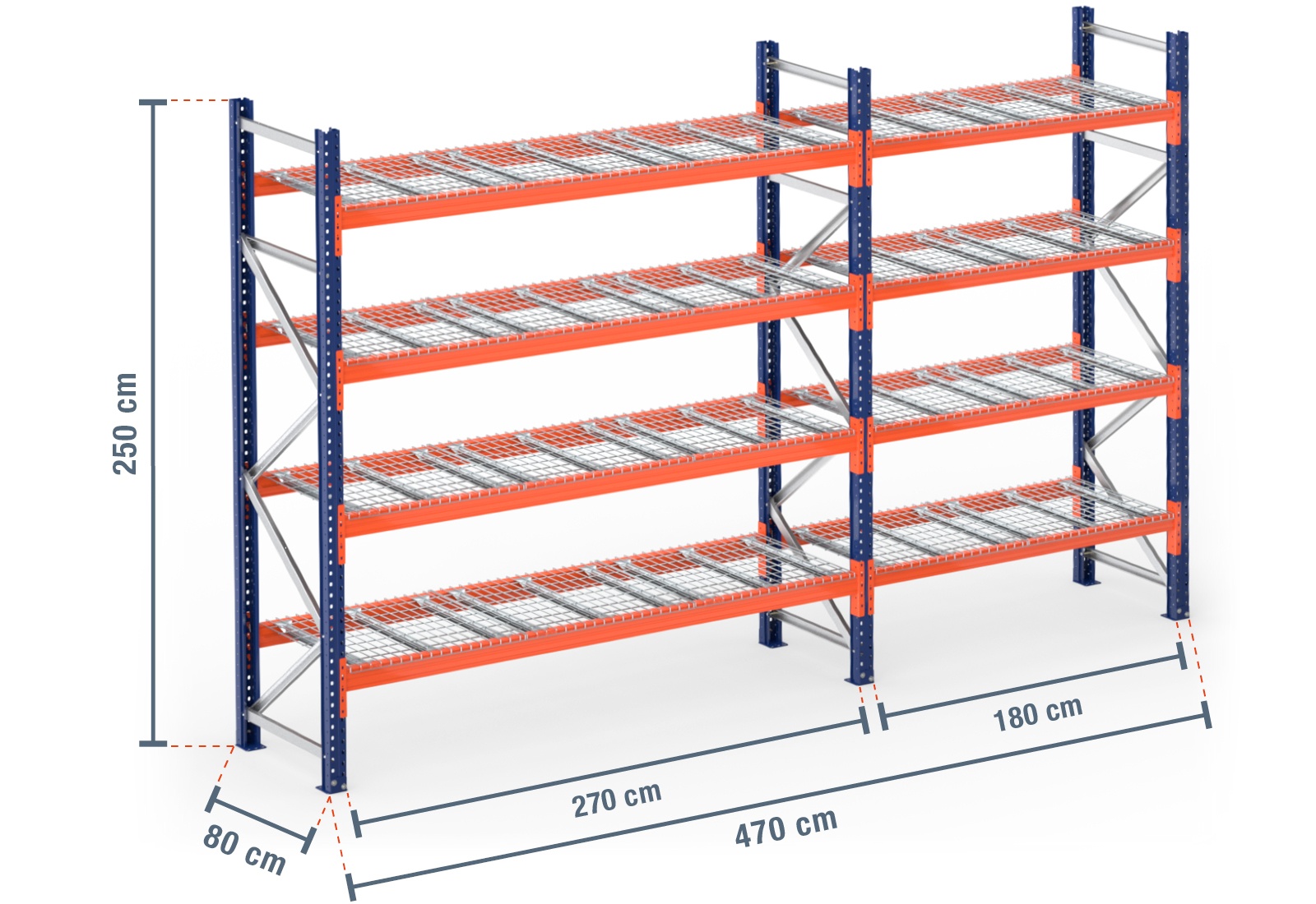 4,7 m pallet racking PR9000 / 80 cm deep / 2,5 m high / 4 levels / rack layer Wire mesh