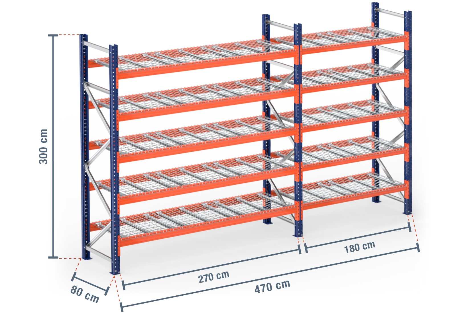 4,7 m pallet racking PR9000 / 80 cm deep / 3 m high / 5 levels / rack layer Wire mesh