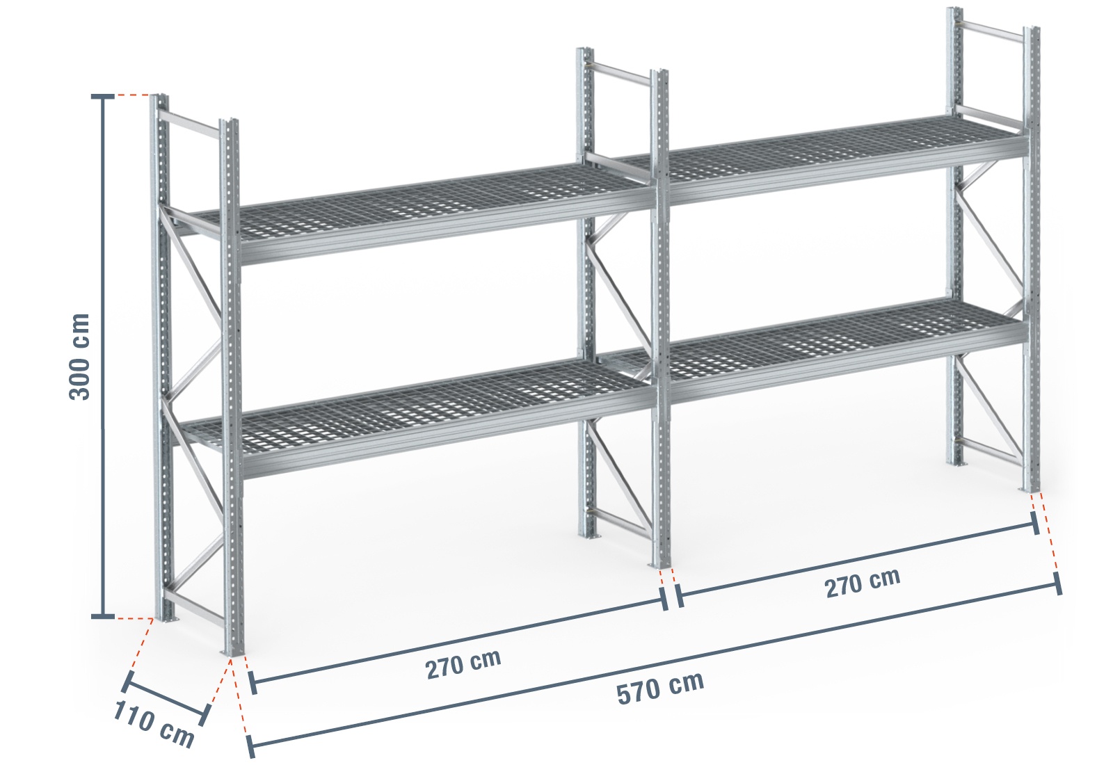 5,7 m pallet rack PR9000F galvanised / 110 cm deep / 3 m high / 2 levels / rack layer Galvanised mesh