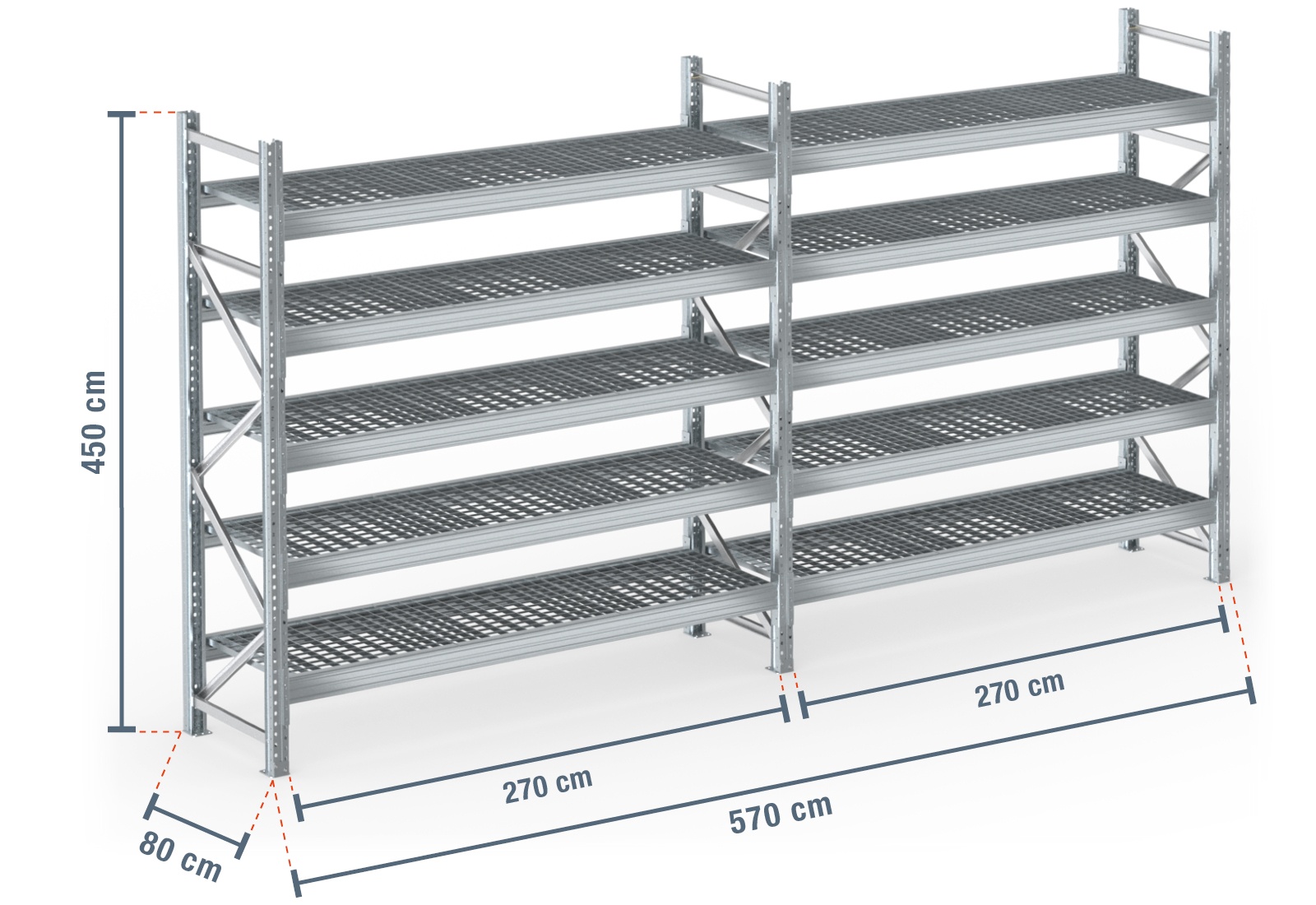5,7 m pallet rack PR9000F galvanised / 80 cm deep / 4,5 m high / 5 levels / rack layer Galvanised mesh