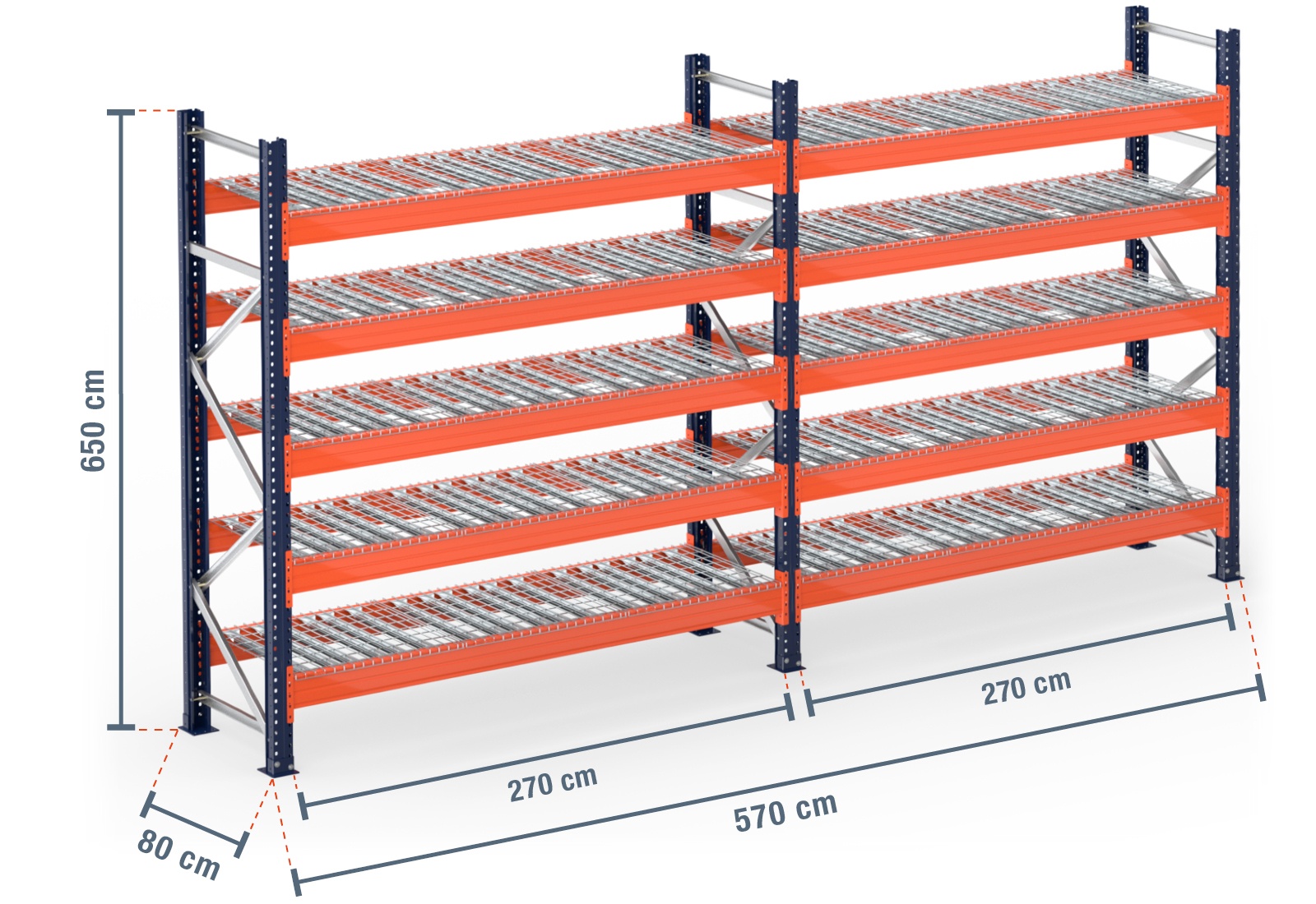 5,7 m pallet racking PR15000 / 80 cm deep / 6,5 m high / 5 levels / rack layer Wire mesh