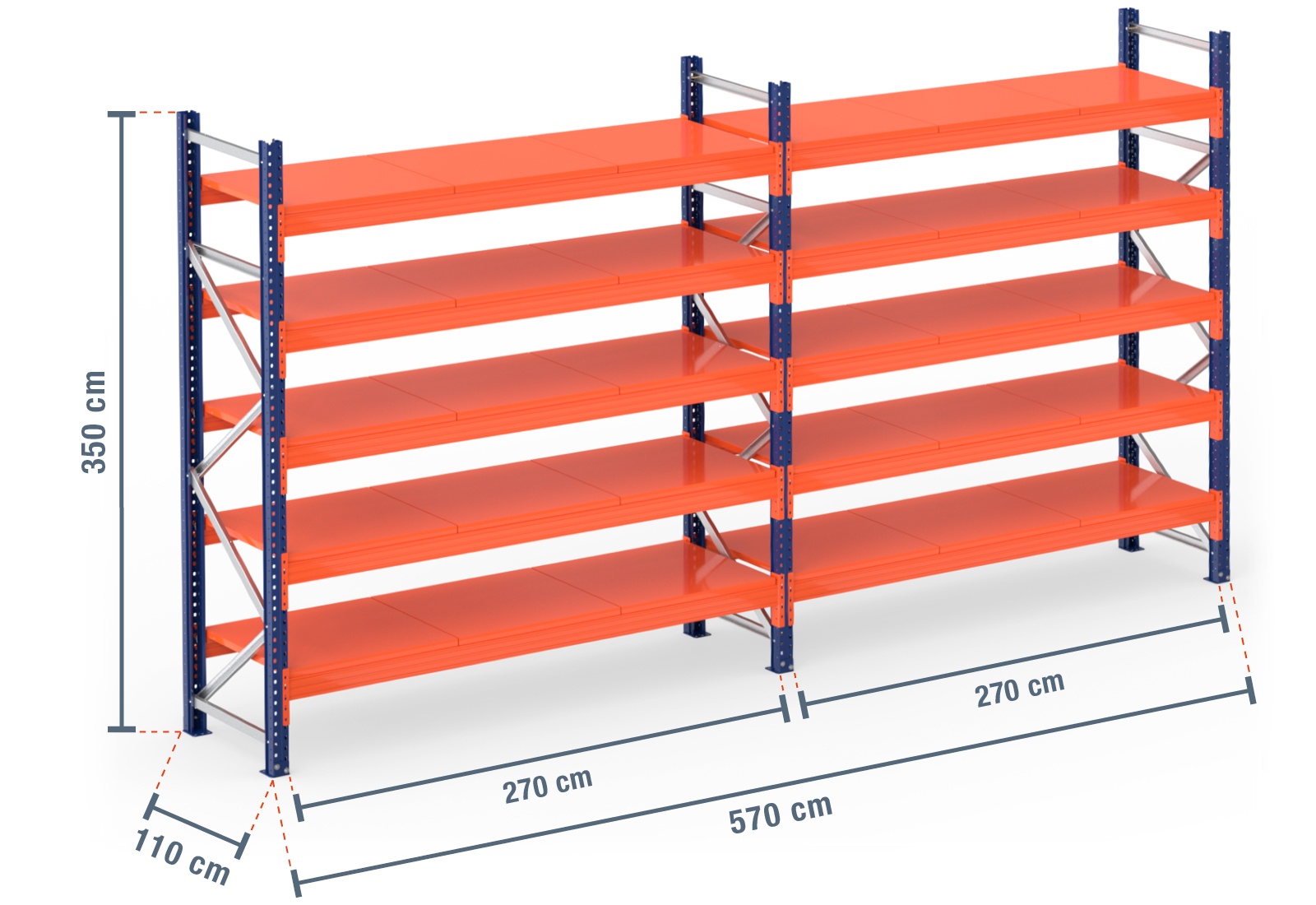 5,7 m pallet racking PR9000 / 110 cm deep / 3,5 m high / 5 levels / rack layer Steel