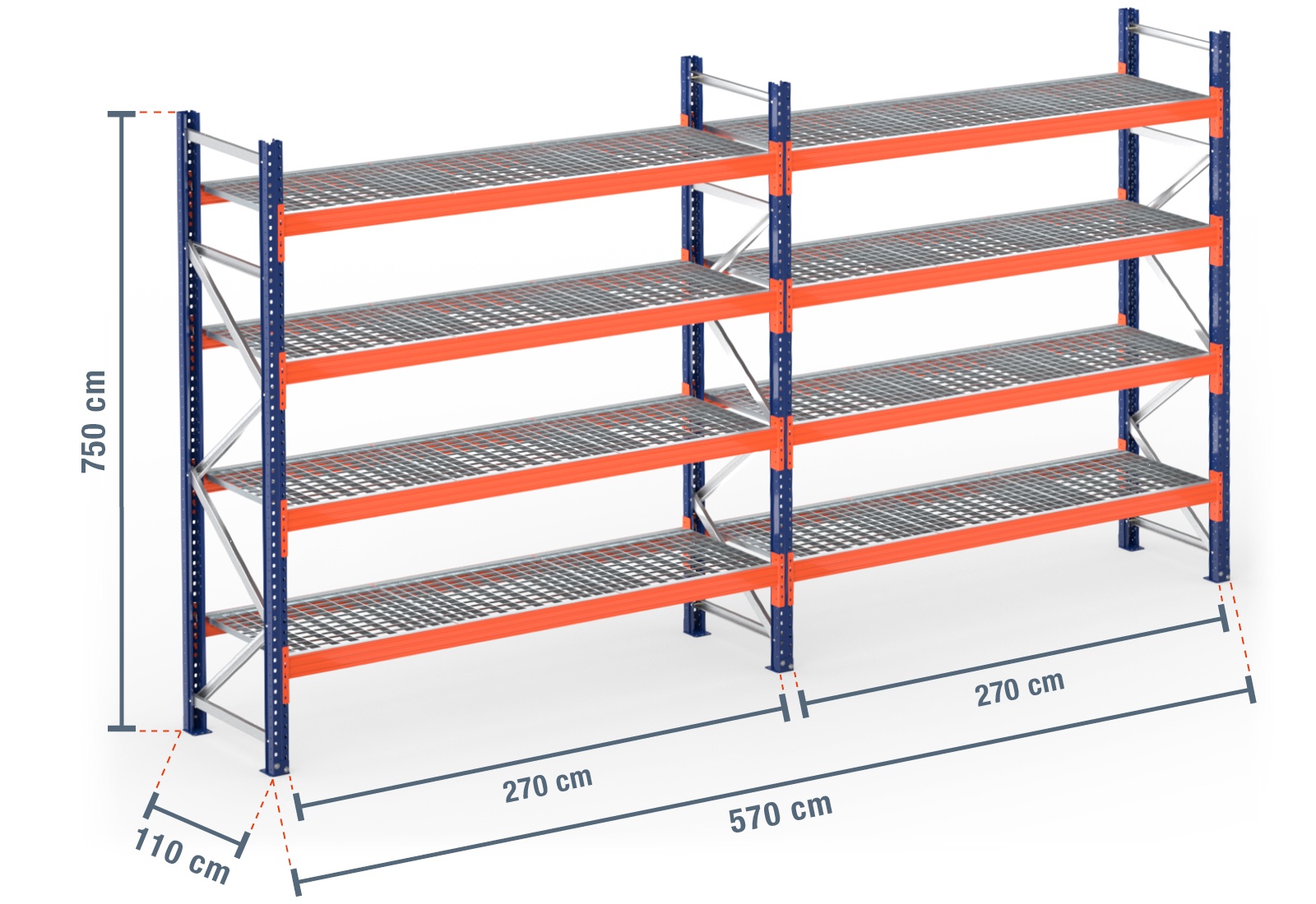 5,7 m pallet racking PR9000 / 110 cm deep / 7,5 m high / 4 levels / rack layer Galvanised mesh