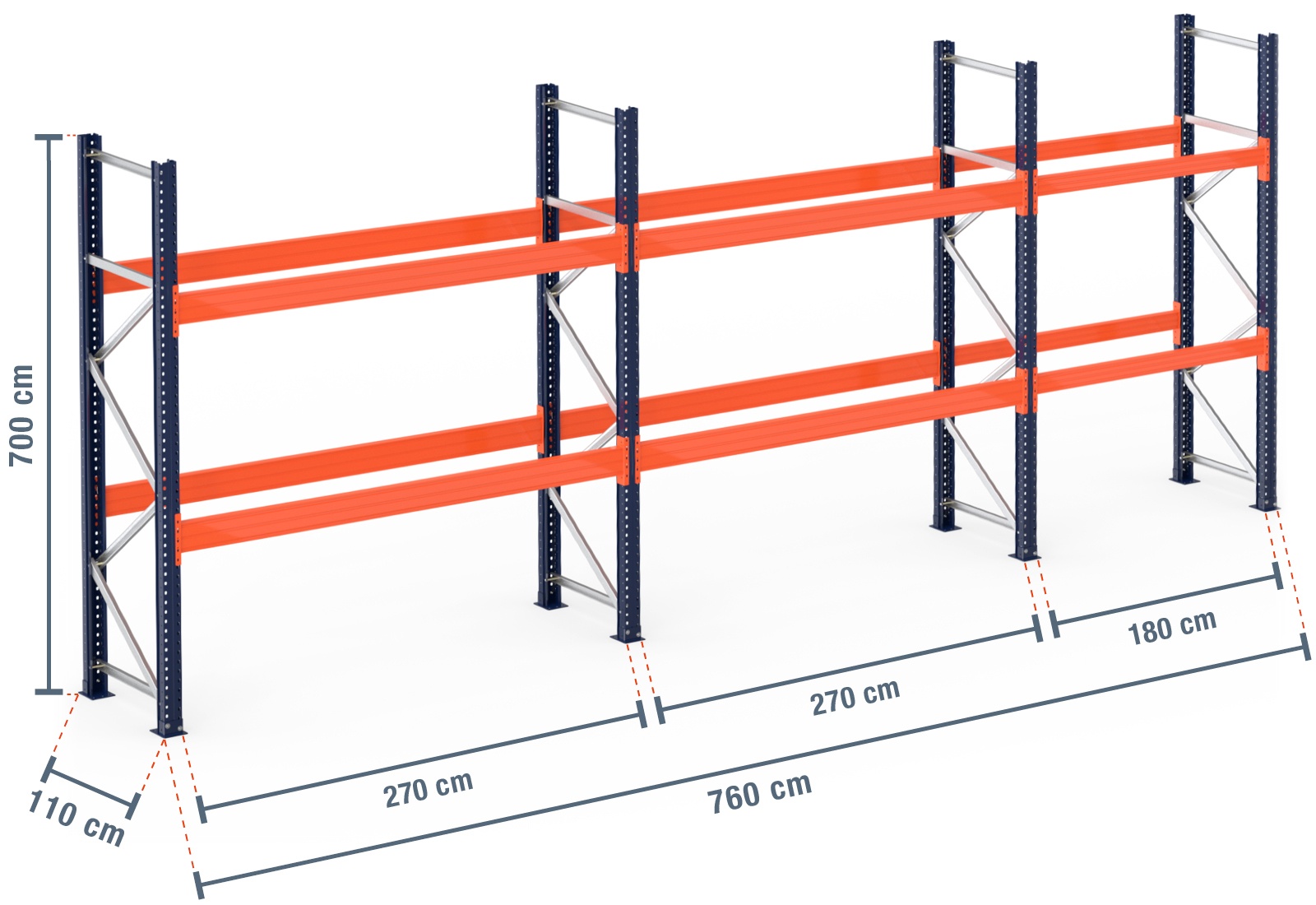 7,6 m pallet rack PR15000 / 110 cm deep / 7 m high / 2 levels for 24 euro pallets