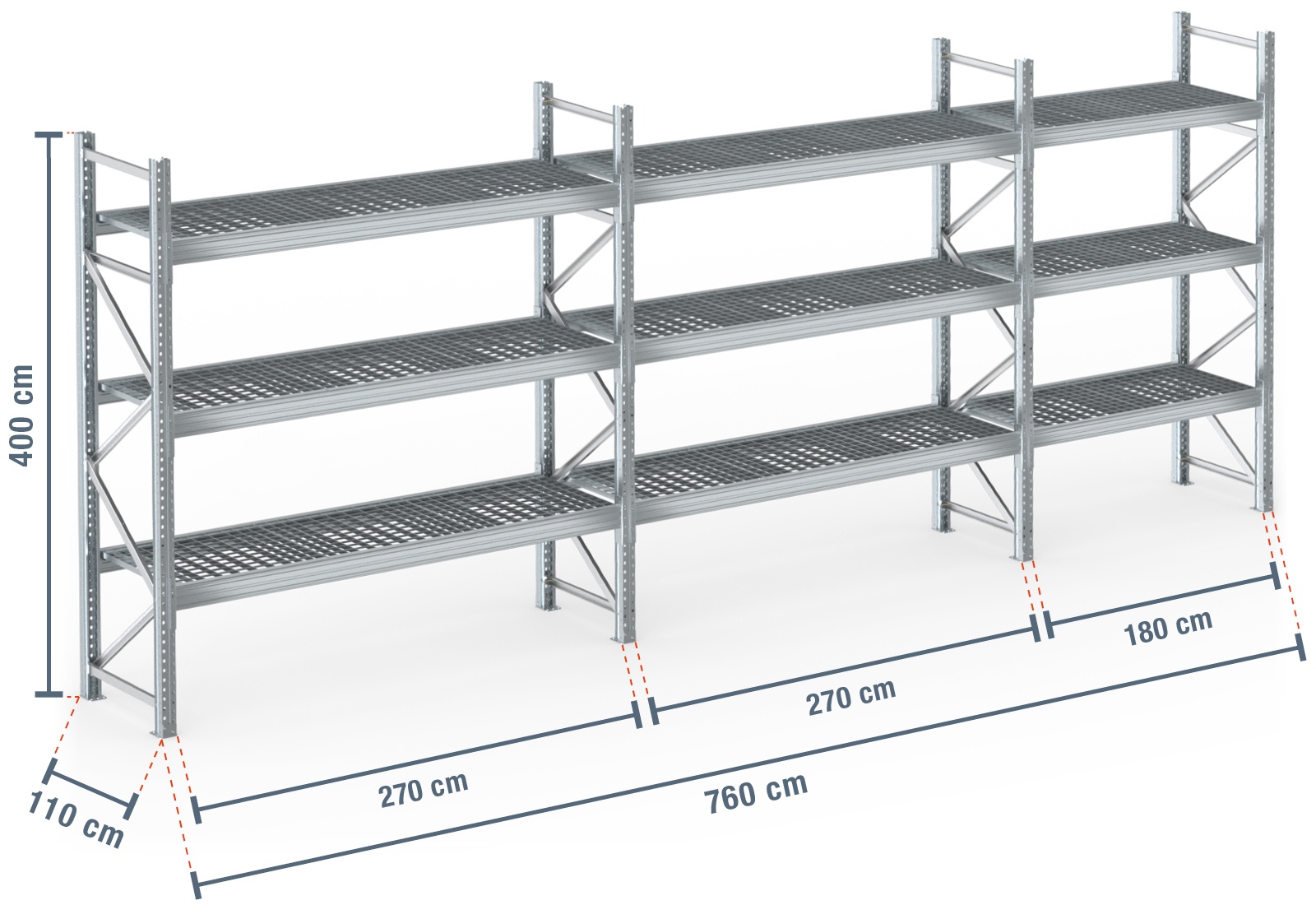 7,6 m pallet rack PR9000F galvanised / 110 cm deep / 4 m high / 3 levels / rack layer Galvanised mesh