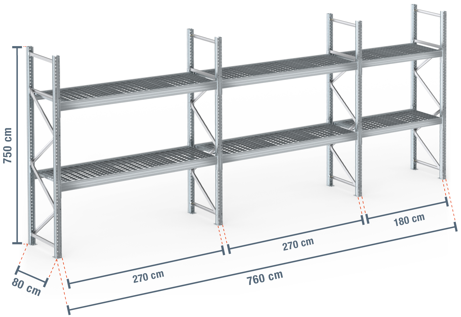7,6 m pallet rack PR9000F galvanised / 80 cm deep / 7,5 m high / 2 levels / rack layer Galvanised mesh