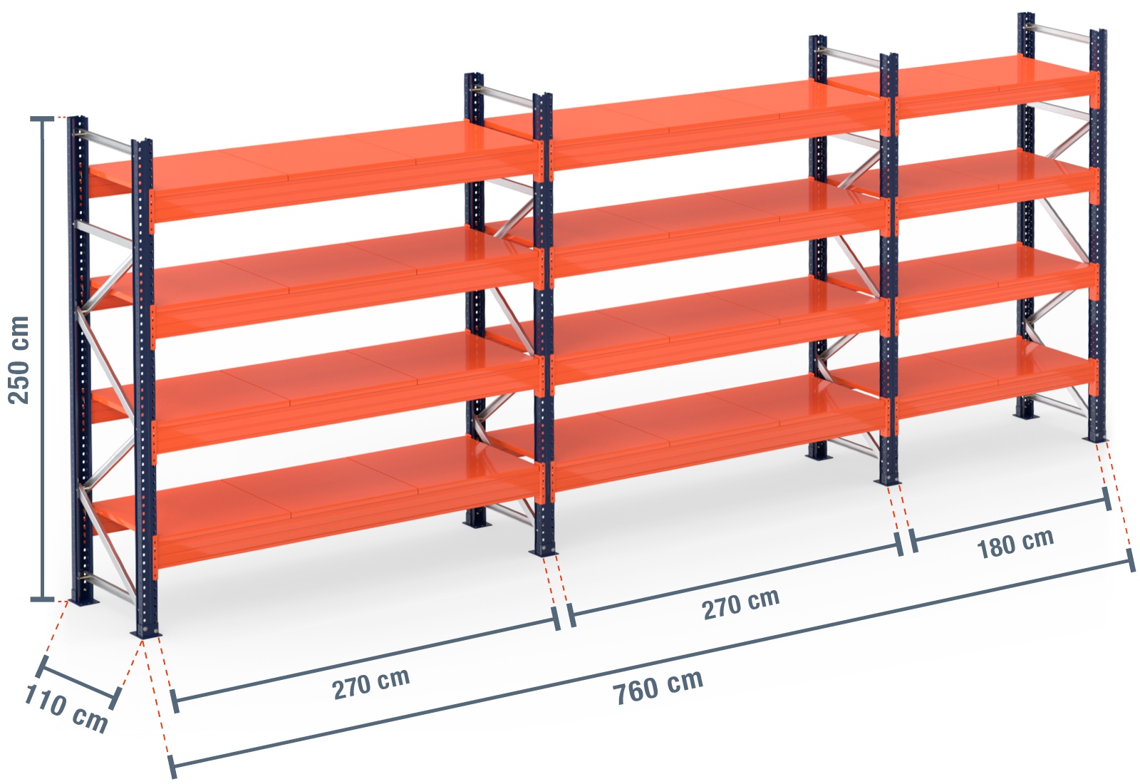 The steel shelf support is extremely durable and robust when compared with wooden boards or mesh shelves. These shelf supports have a long service life and are particularly suitable for the storage of liquids such as paint, oil or fuel. The steel shelf offers a maximum load capacity of 1.000 kg per module with an even weight distribution. It is also painted in the bright signal colour of orange. This ensures safety as the shelves can be easily seen from a distance. Its special design enables the steel shelf to be secured to the beams themselves, so it simply needs to be placed in position. When loading your pallet rack, please observe the maximum shelf and unit loads specified.