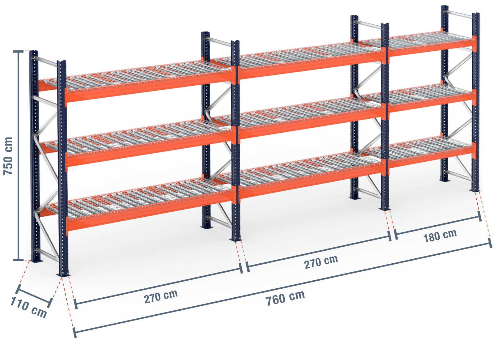 7,6 m pallet racking PR15000 / 110 cm deep / 7,5 m high / 3 levels / rack layer Wire mesh