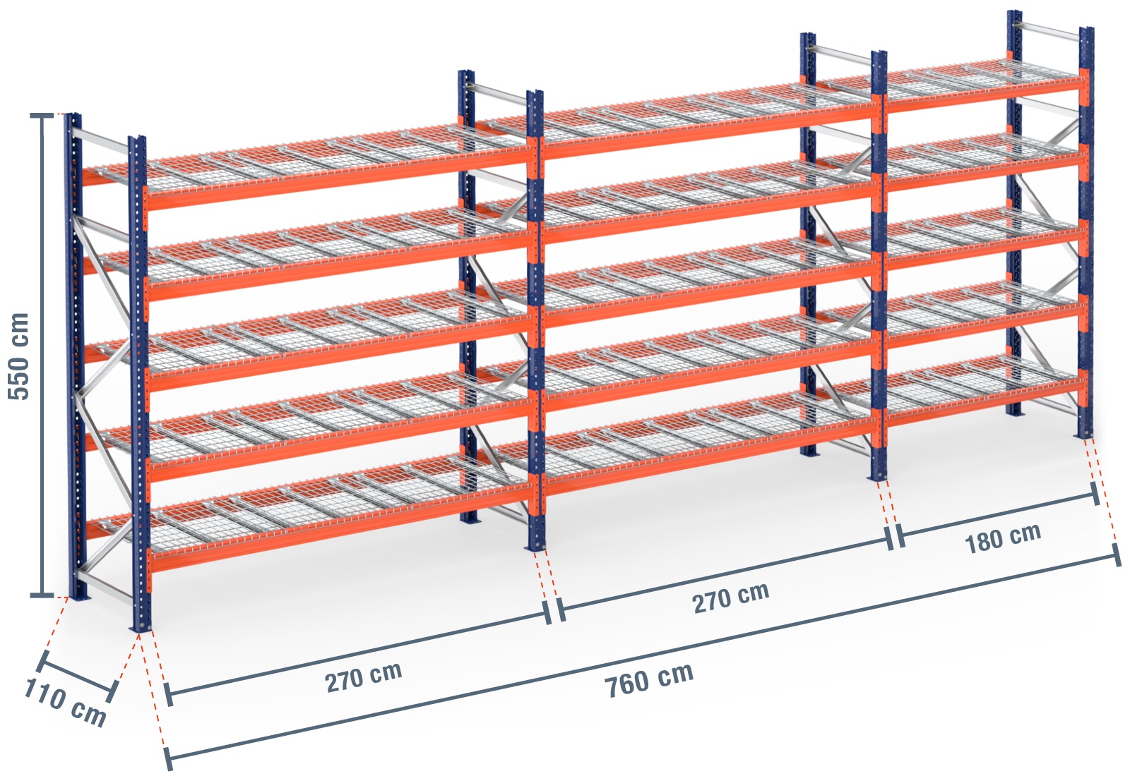 7,6 m pallet racking PR4500 / 110 cm deep / 5,5 m high / 5 levels / rack layer Wire mesh