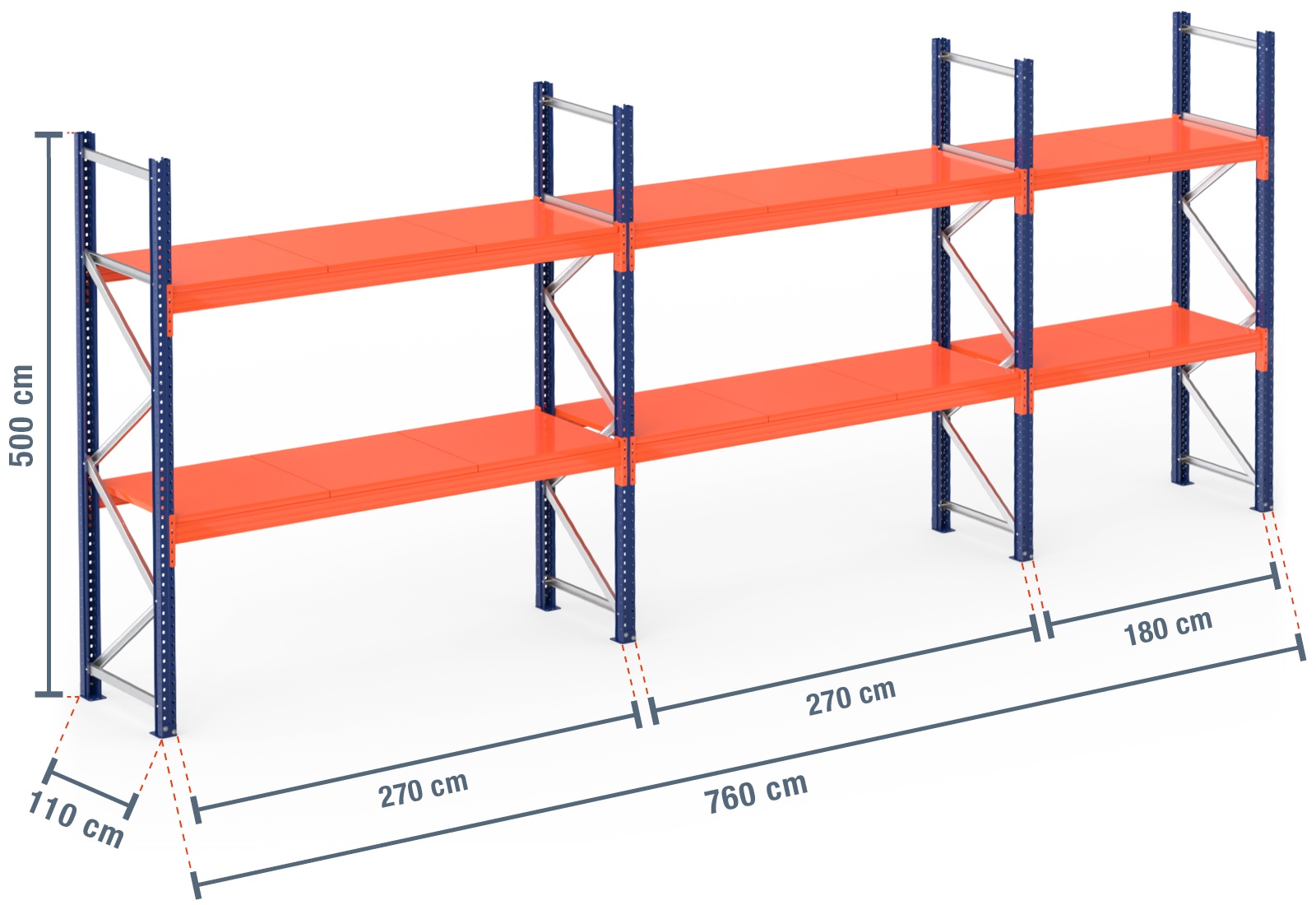 7,6 m pallet racking PR4500 / 110 cm deep / 5 m high / 2 levels / rack layer Steel