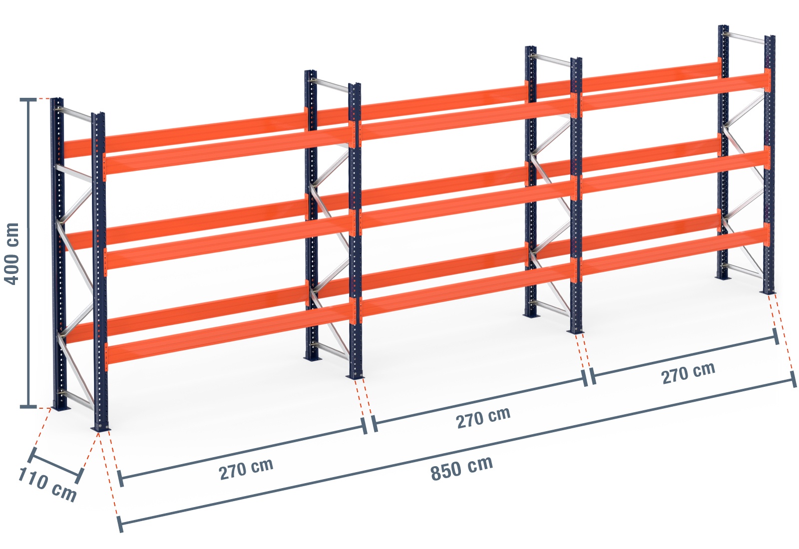 8,5 m pallet rack PR15000 / 110 cm deep / 4 m high / 3 levels for 36 euro pallets