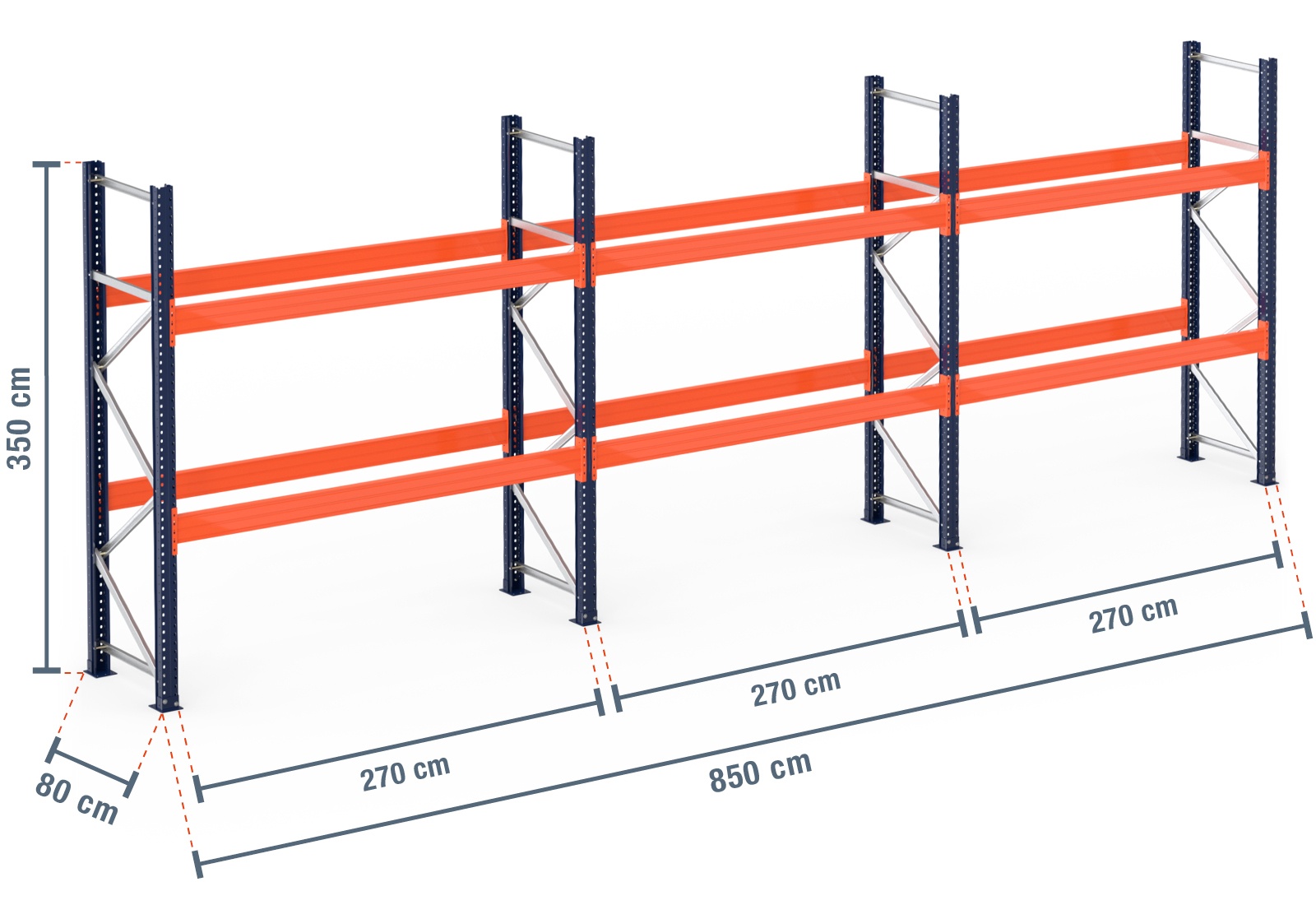 8,5 m pallet rack PR15000 / 80 cm deep / 3,5 m high / 2 levels for 27 euro pallets