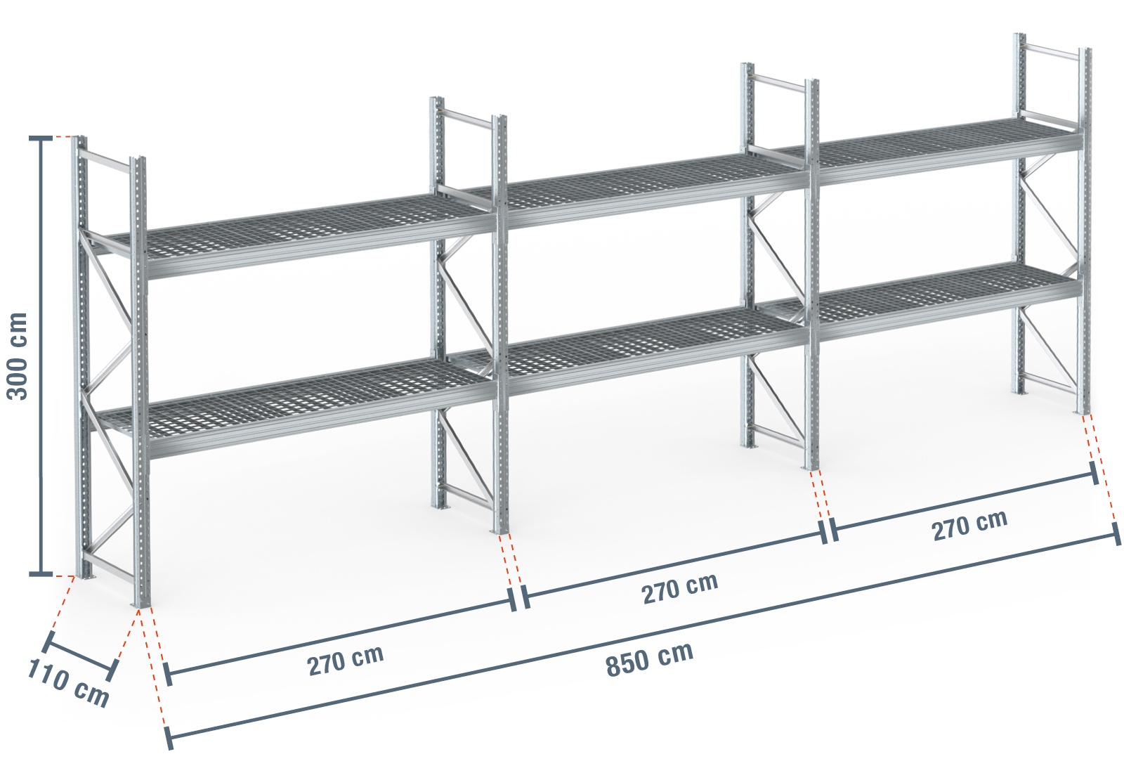 8,5 m pallet rack PR9000F galvanised / 110 cm deep / 3 m high / 2 levels / rack layer Galvanised mesh