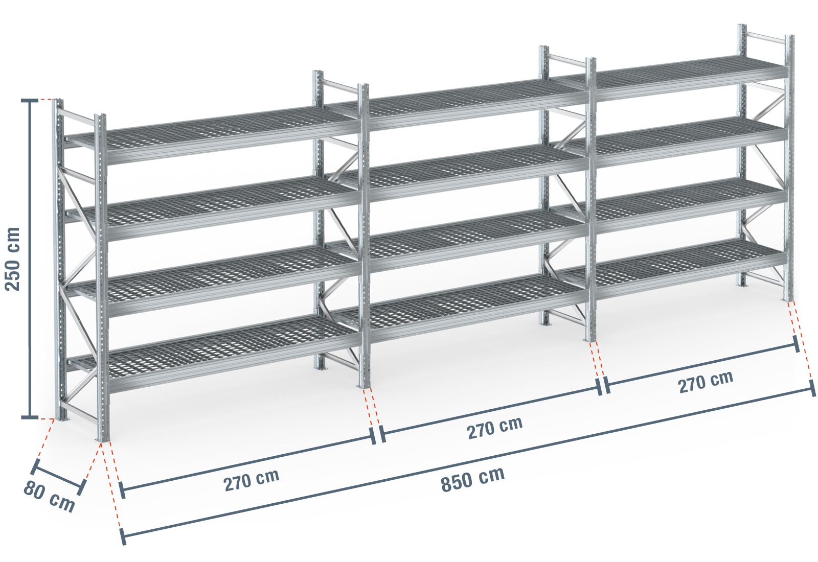 8,5 m pallet rack PR9000F galvanised / 80 cm deep / 2,5 m high / 4 levels / rack layer Galvanised mesh