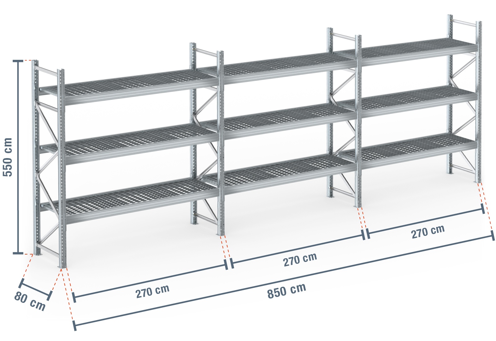 8,5 m pallet rack PR9000F galvanised / 80 cm deep / 5,5 m high / 3 levels / rack layer Galvanised mesh