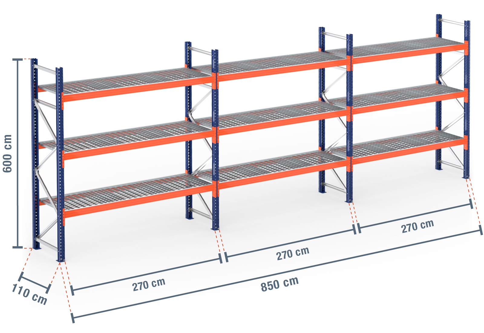 8,5 m pallet racking PR9000 / 110 cm deep / 6 m high / 3 levels / rack layer Galvanised mesh