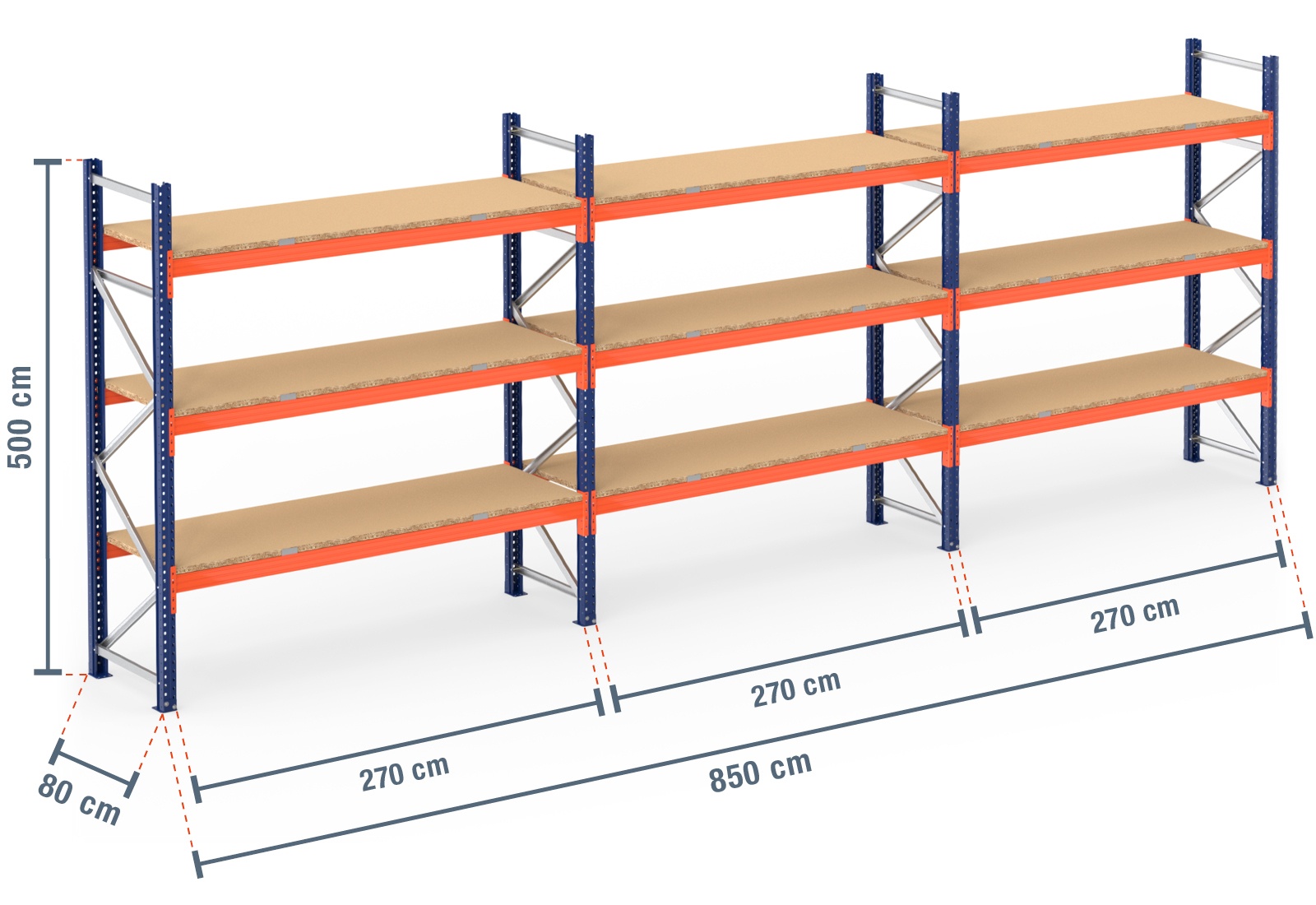 8,5 m pallet racking PR9000 / 80 cm deep / 5 m high / 3 levels / rack layer Wood