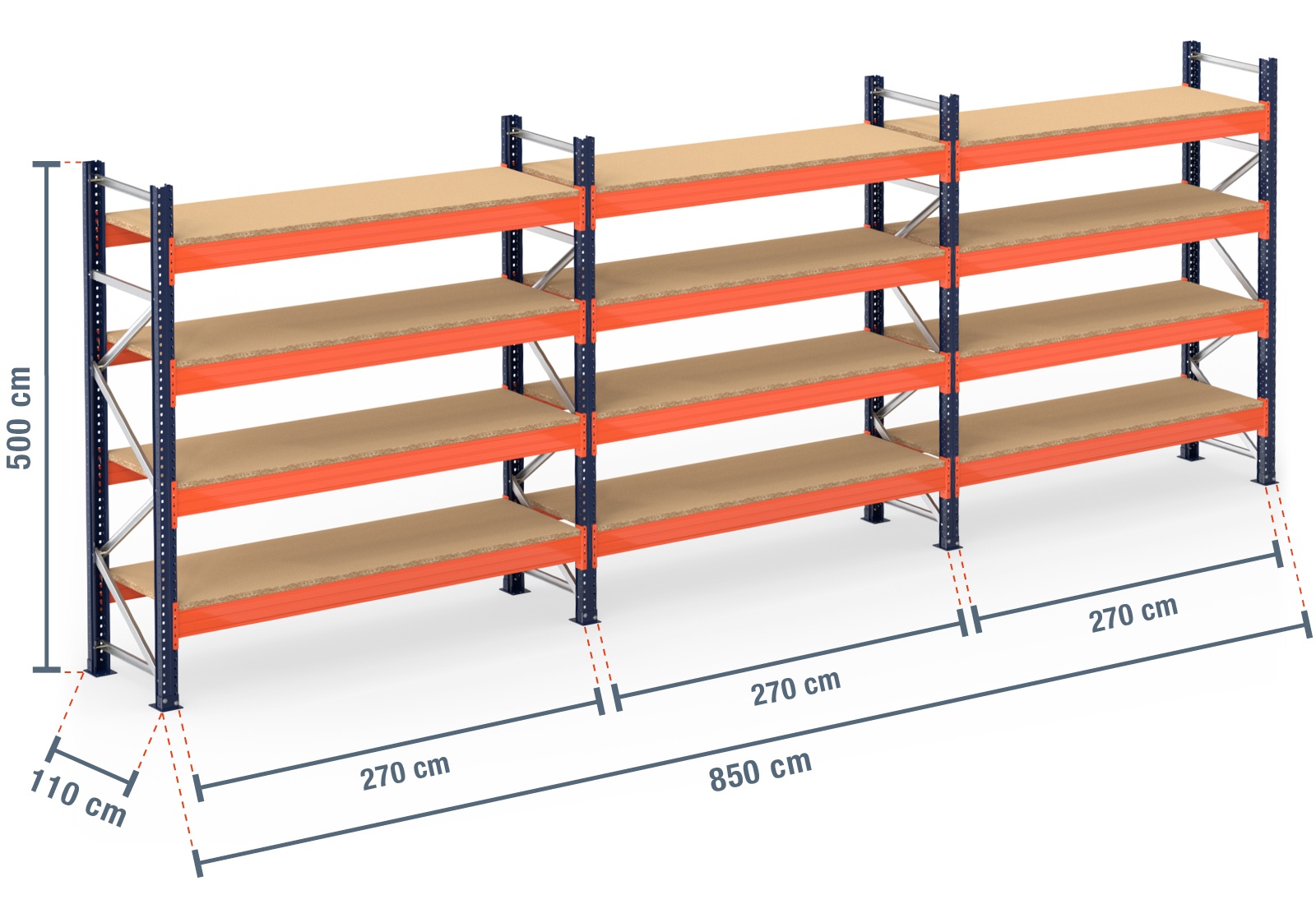 8,5 m pallet racking PR15000 / 110 cm deep / 5 m high / 4 levels / rack layer Wood