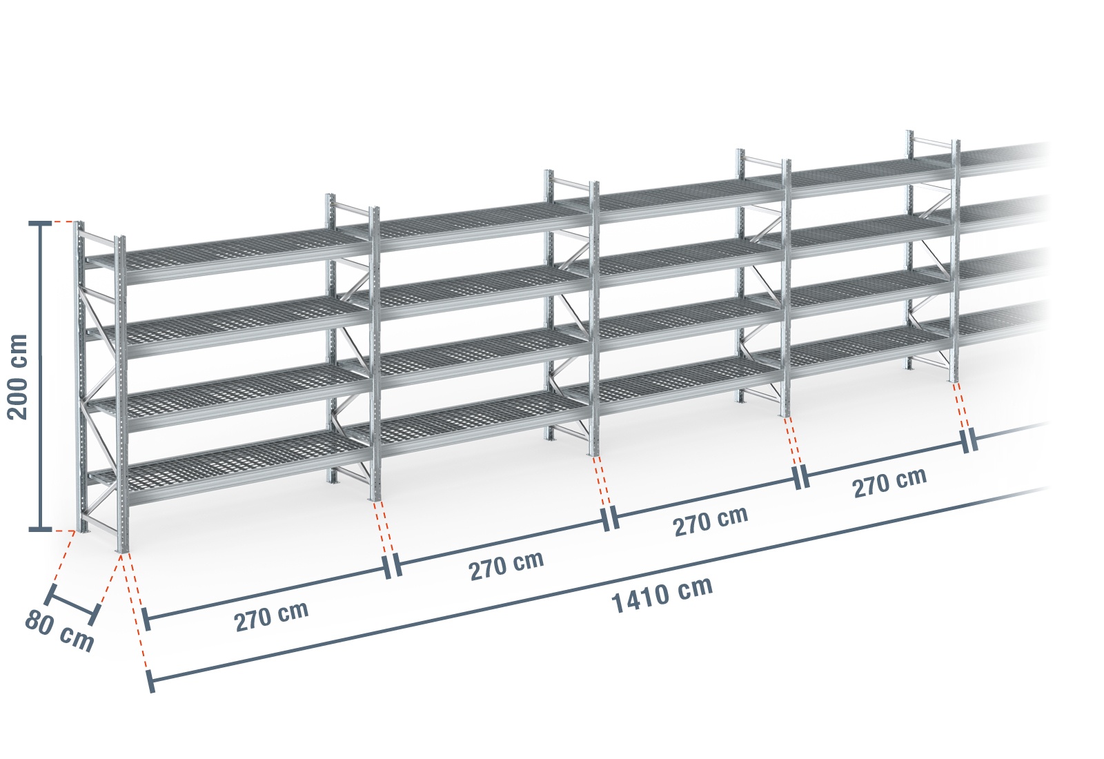 14,1 m pallet rack PR9000F galvanised / 80 cm deep / 2 m high / 4 levels / rack layer Galvanised mesh