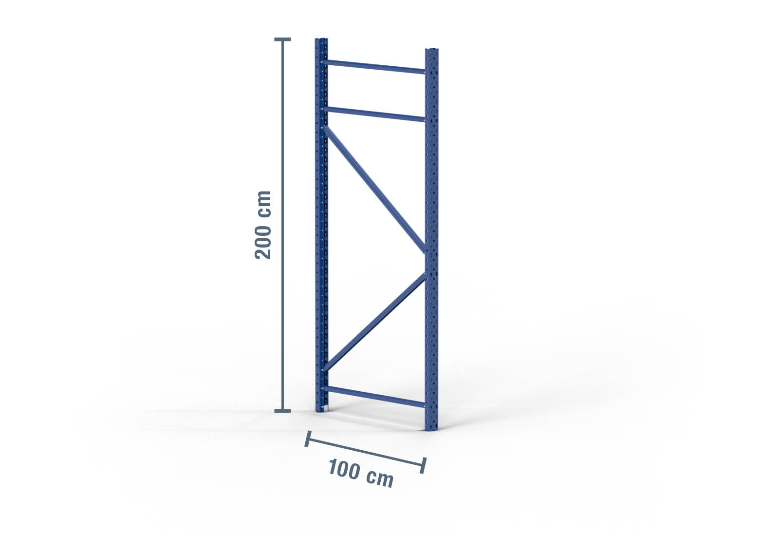 Storage rack upright made of cold-rolled steel with a height of 2 m and a depth of 100 cm. The unit load capacity (max. load between two storage rack uprights) is 2.000 kg. The powder coating in blue protects the rack upright against corrosion. It is secured to the floor with M8 x 55 mm bolt anchors to provide stability for the complete storage rack.