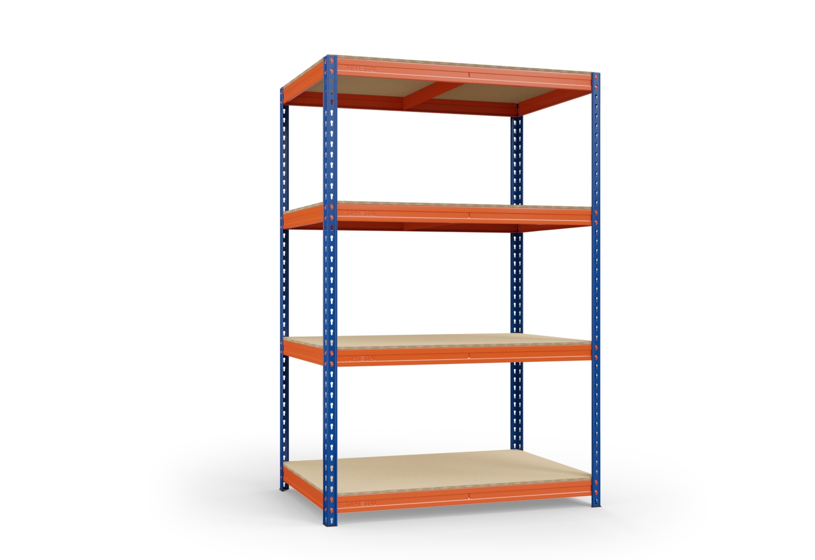 The shelving rack FB500 can be loaded on any of the 4 levels 500 kg with and has a max. load capacity (total load between two uprights) of 2.000 kg with an evenly distributed load. The simple plug-in system of the FB500 makes it possible to assemble or disassemble it quickly and easily. The four wooden shelves (with a thickness of 15 mm) are placed in two longitudinal & two transverse beams and on a support bar to increase load capacity.