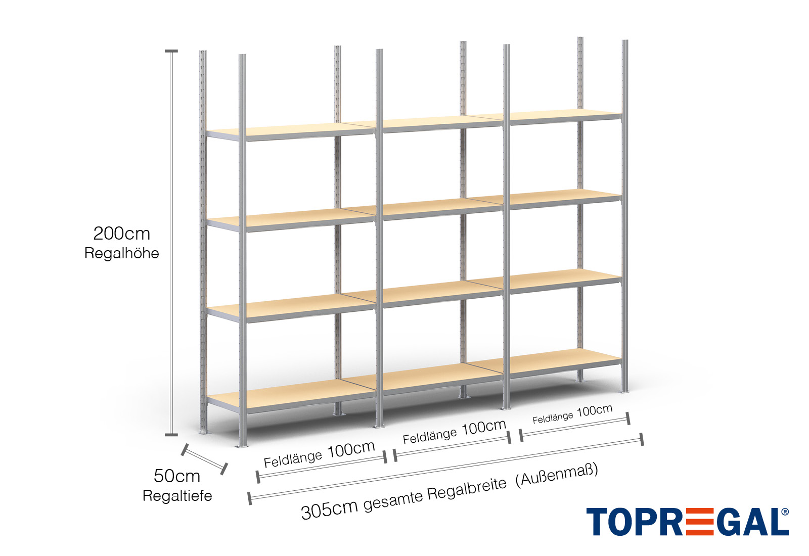 3 m heavy duty shelf FB200 / 50 cm deep / 2 m high / 4 levels / rack layer Wood / compartment load capacity 200 kg