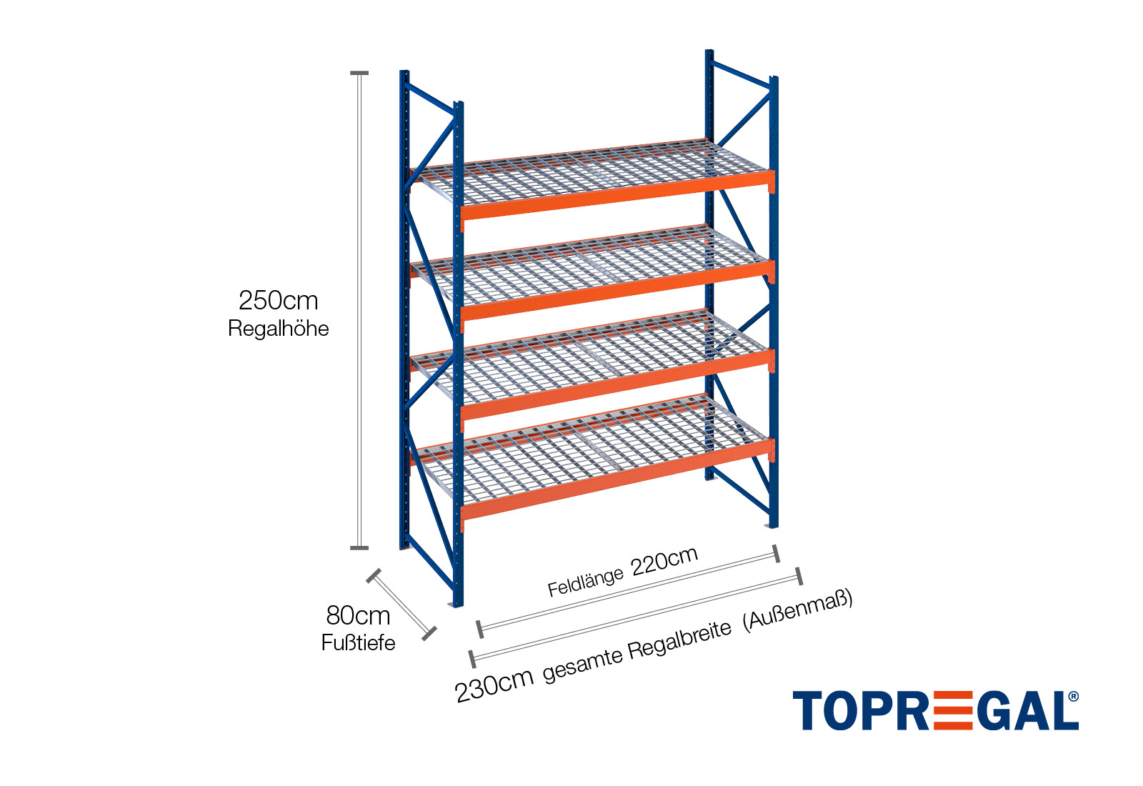 All data refer to evenly distributed loads. When loaded, the shelf load and field load must not be exceeded. In principle, the current guidelines on safety and health at work (german DGUV Rule 208-061) apply during use. TOPREGAL accepts no liability for accidents/damage caused by improper use. Our expert advisory team will be pleased to answer any questions you may have. Dimensions given are approximate and may deviate by a few centimetres. Contact us if you need the exact dimensions for your desired product.
