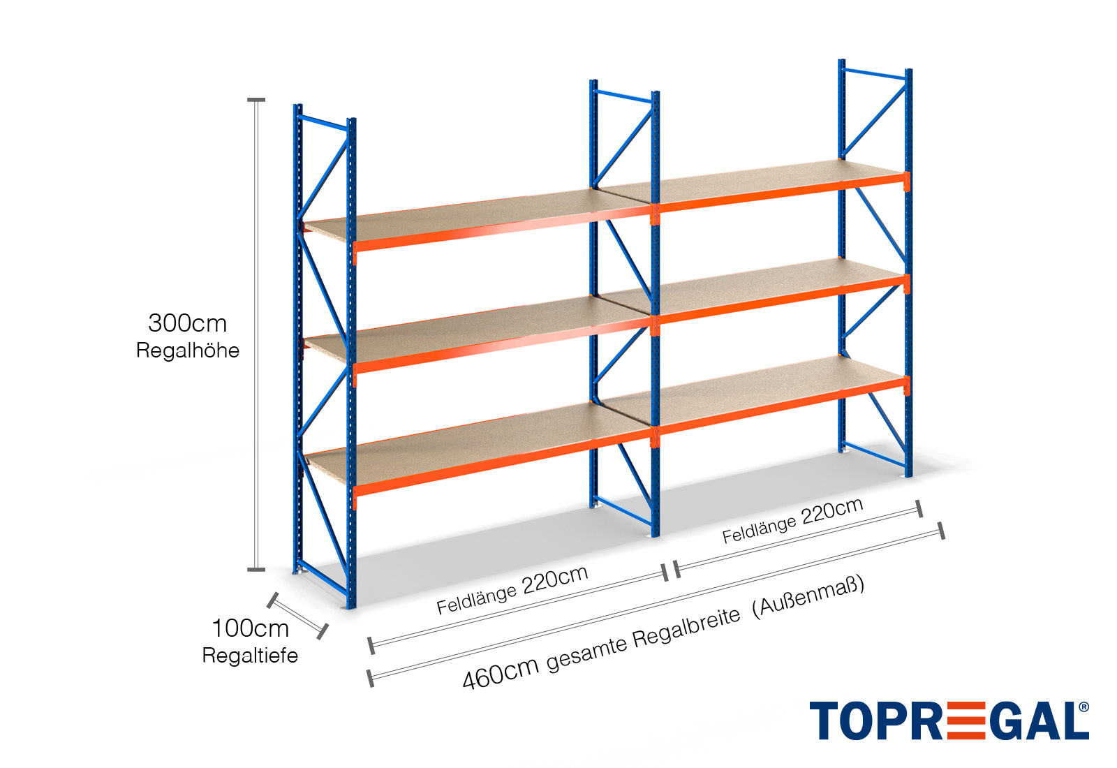 All data refer to evenly distributed loads. When loaded, the shelf load and field load must not be exceeded. In principle, the current guidelines on safety and health at work (german DGUV Rule 208-061) apply during use. TOPREGAL accepts no liability for accidents/damage caused by improper use. Our expert advisory team will be pleased to answer any questions you may have. Dimensions given are approximate and may deviate by a few centimetres. Contact us if you need the exact dimensions for your desired product.