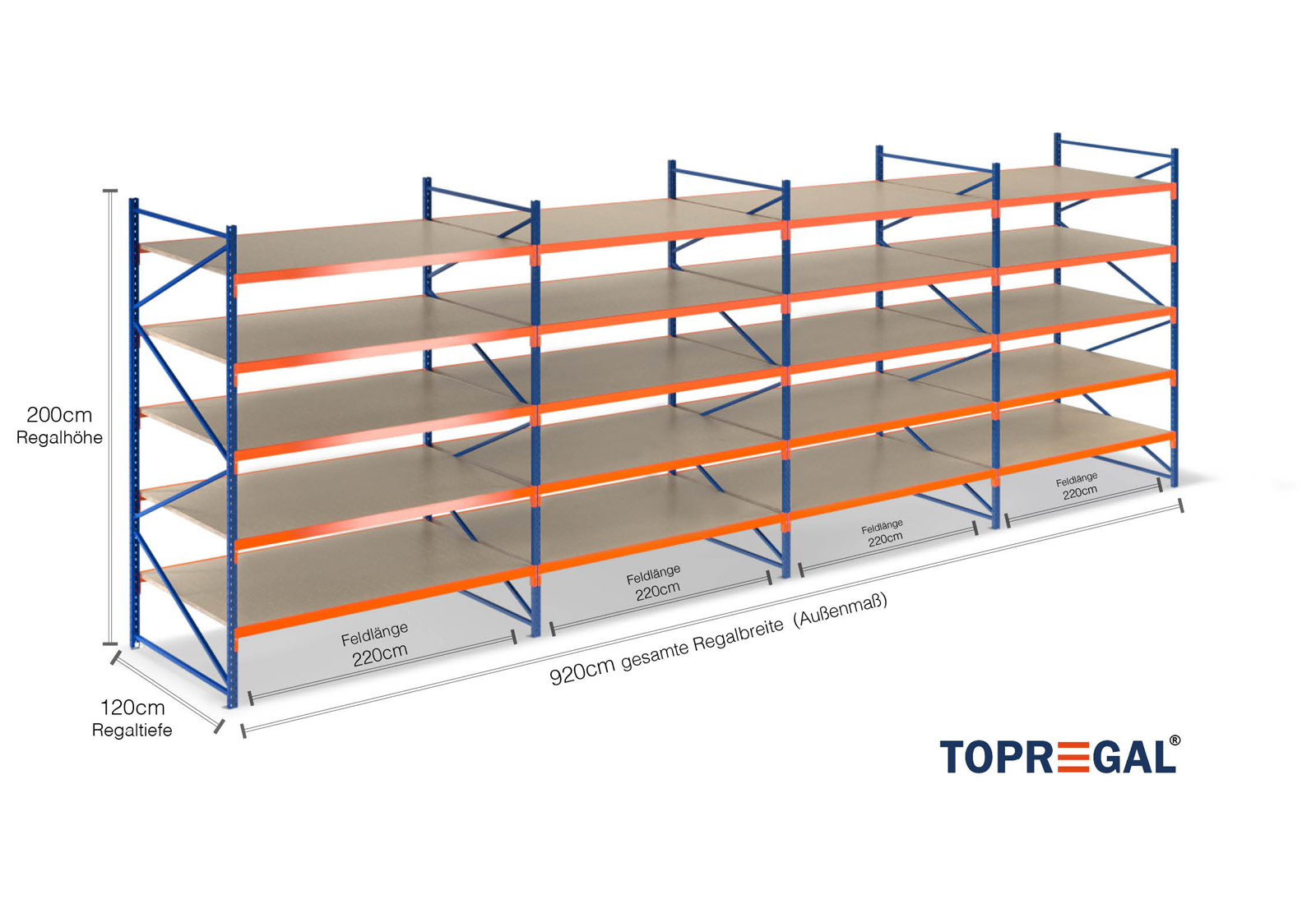 9,2 m storage rack LR2000 / 120 cm deep / 2 m high / 5 levels / rack layer Wood