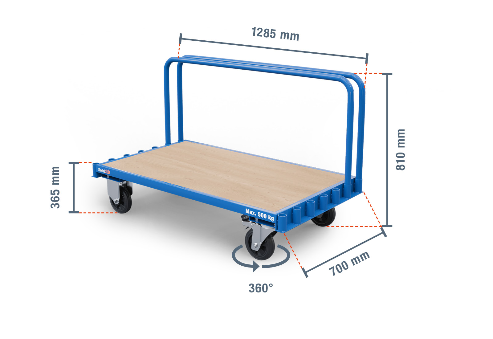 The BGW500/7 trolley from SolidHub is the ideal solution for companies that need to transport heavy loads efficiently and safely. With a load capacity of up to 500 kg, this transport trolley is ideal for a wide range of applications in industry and trade.