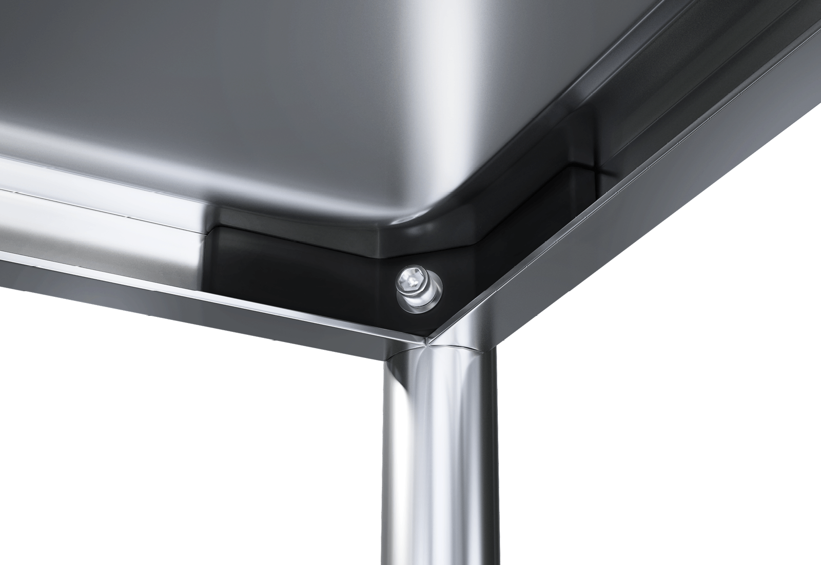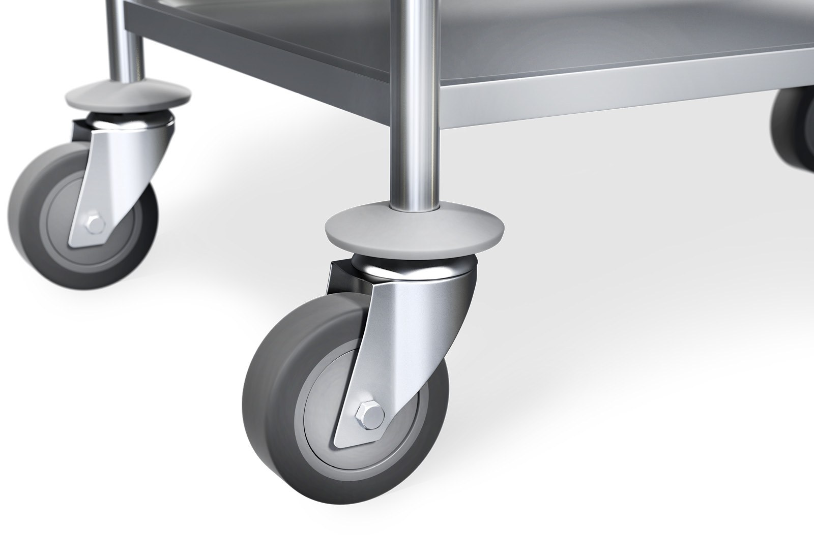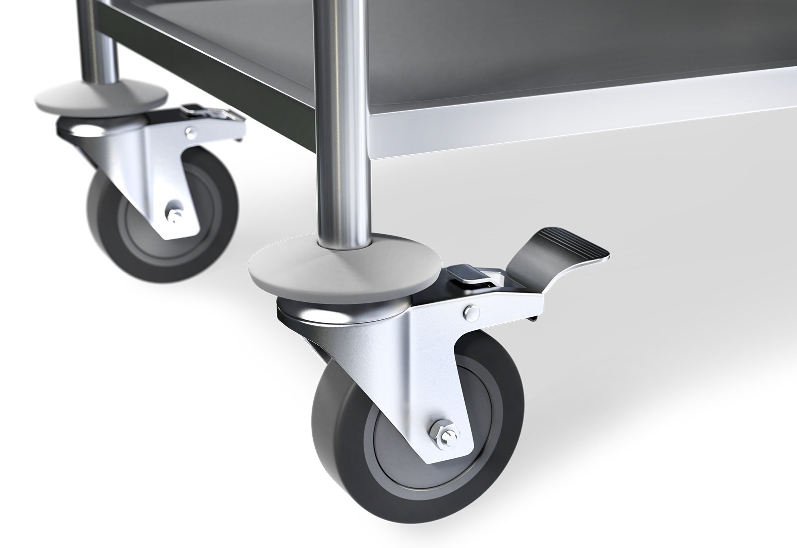The 4 TPR swivel castors with ball bearings make the trolley manoeuvrable and allow it to be pushed easily and quietly. Two of the castors are equipped with parking brakes so the trolley can be loaded and unloaded safely. The rubber bumpers on all four castors ensure that nearby objects, such as walls and table legs, are not damaged in the course of a hectic working day. Thanks to the round tube brackets on the short sides, the shelf trolley can be moved easily and comfortably even when carrying a full load (of up to 150 kg).