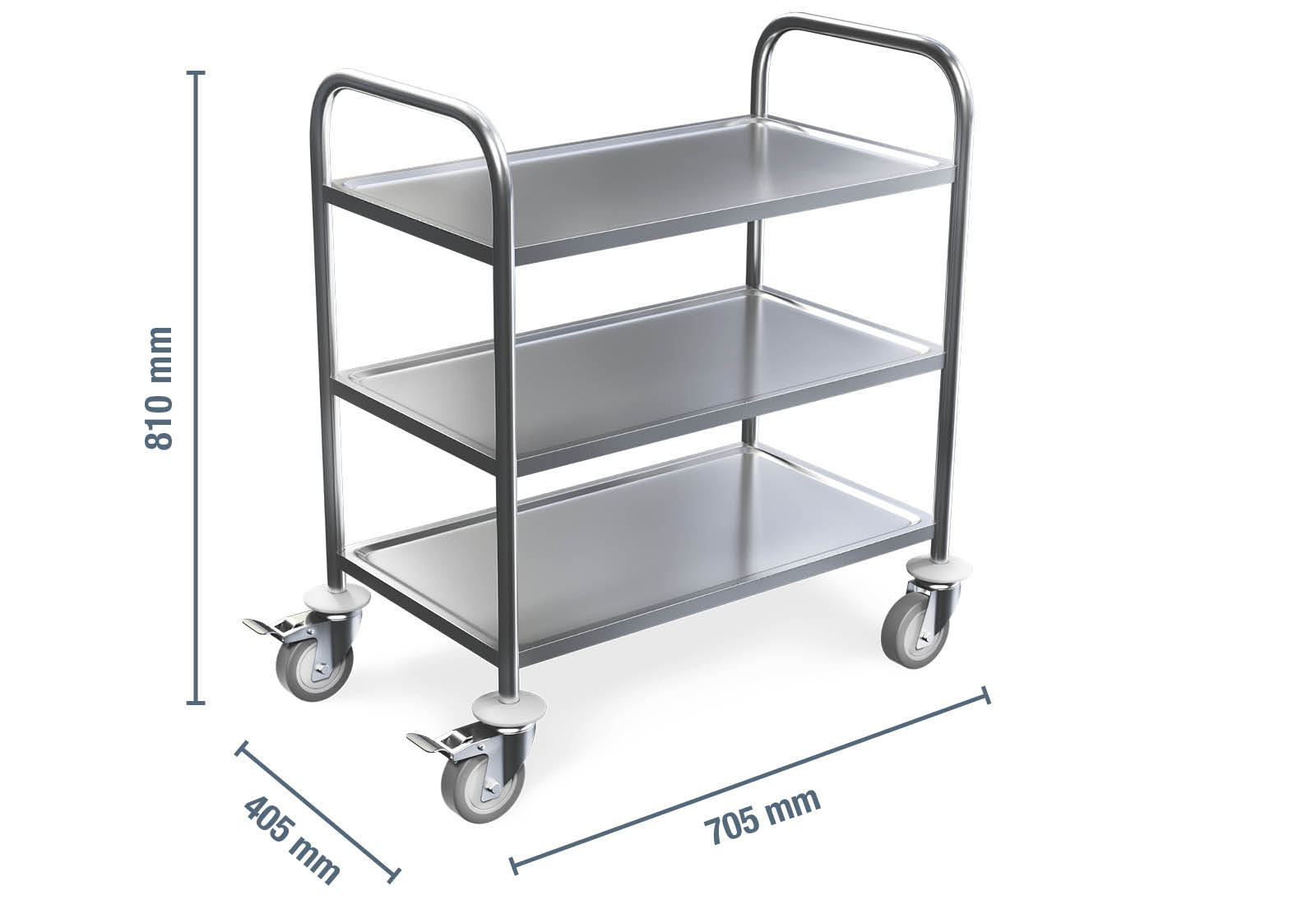 The stainless steel shelf trolley (alloys: SS430 shelves and SS201 round tubes), with 3 stable shelves, is ideal for use in catering establishments such as hotels, canteens or kitchens due to its robust and high-quality workmanship.