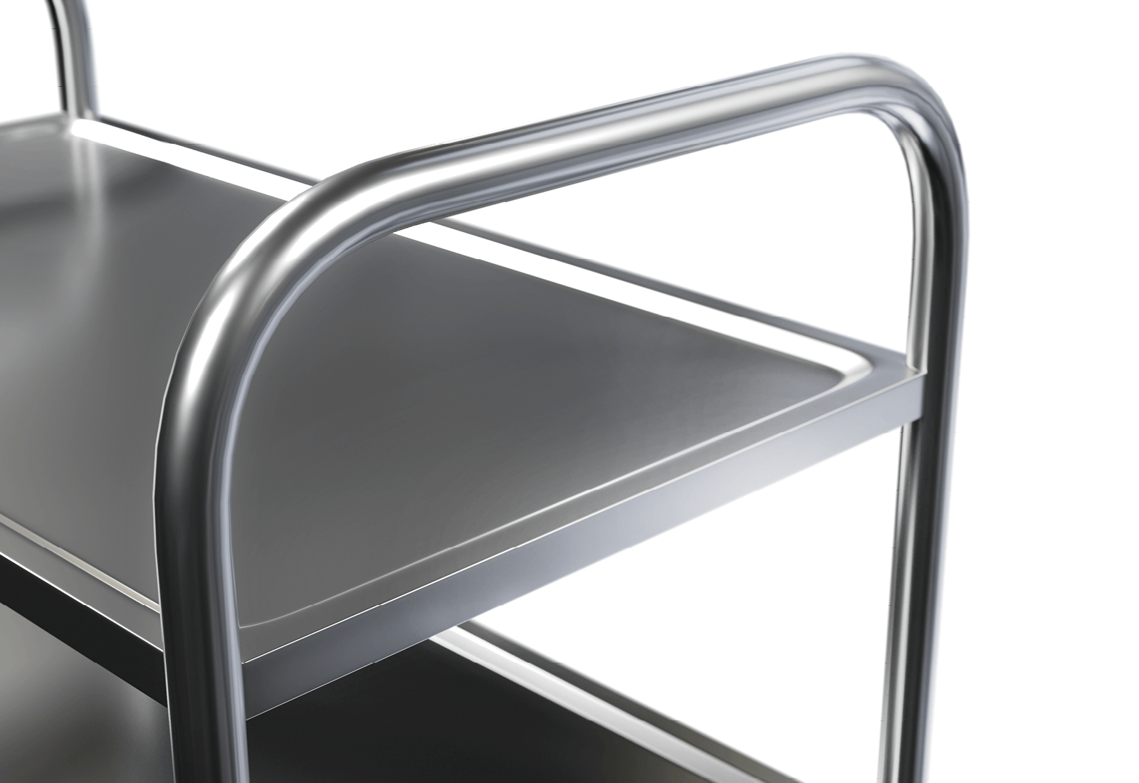 The stainless steel serving trolley can transport drinks, food or tablewear easily and safely from A to B. Heavy objects such as filled saucepans can be transported on the 3 shelves with a weight limit of 50 kg per shelf (assuming the weight is evenly distributed). Thanks to its smooth, scratch-resistant surface, the stainless steel serving trolley is very resilient and easy to clean.