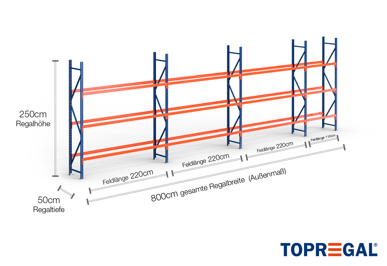 All data refer to evenly distributed loads. When loaded, the shelf load and field load must not be exceeded. In principle, the current guidelines on safety and health at work (german DGUV Rule 208-061) apply during use. TOPREGAL accepts no liability for accidents/damage caused by improper use. Our expert advisory team will be pleased to answer any questions you may have. Dimensions given are approximate and may deviate by a few centimetres. Contact us if you need the exact dimensions for your desired product.