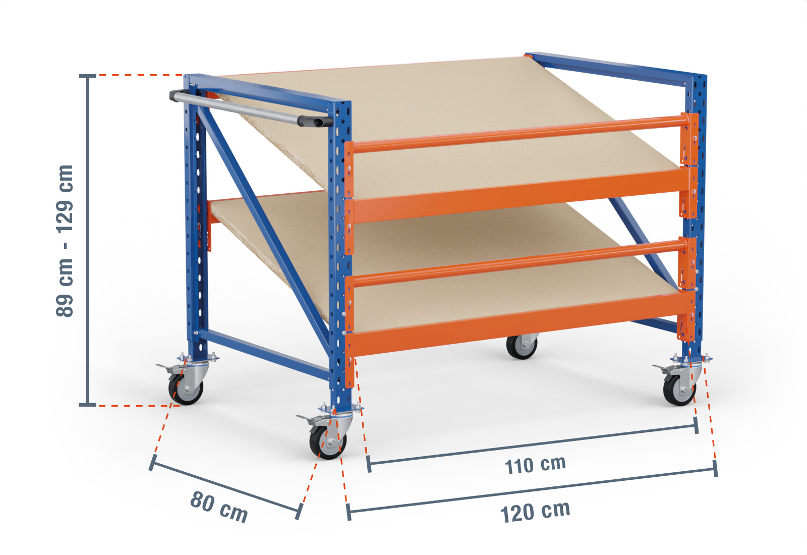 This mobile kanban rack from TOPREGAL comprises 2 levels, each of which is equipped with an angled wooden shelf. One level also has two stepped beams, which are the actual load-bearing elements, and a round beam used as fall protection. These beams are painted in orange and can be attached at individual increments of 50 mm. This improves the ergonomics of your rack and allows you to configure your compartments to be an optimal size.