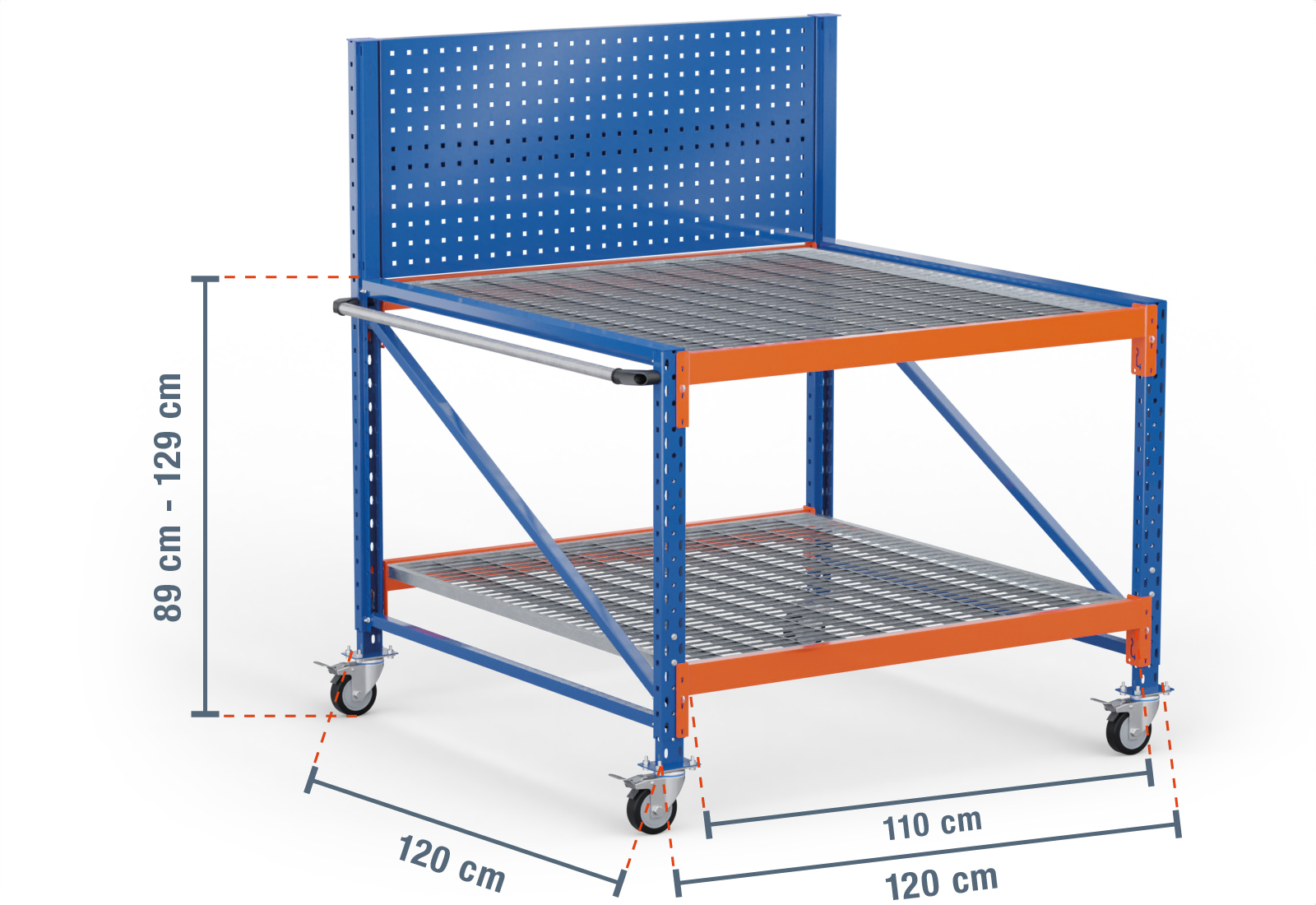 1,2 m mobile worktable MFW1000-AT / 120 cm deep / 890 - 1.290 mm high / 2 levels / rack layer Galvanised mesh / perforated rear panel