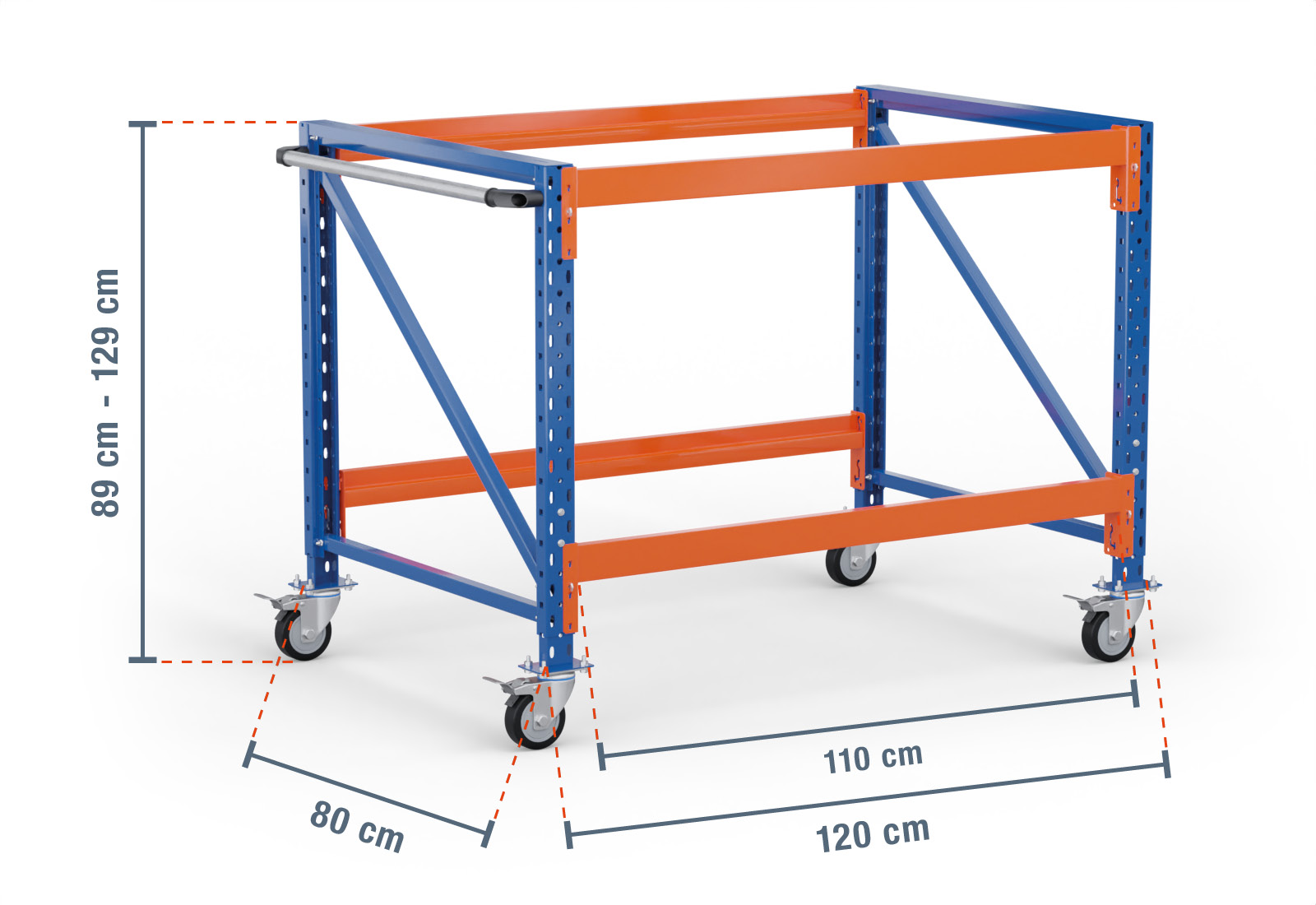 Thanks to the special design of our stepped beams, the optionally inserted rack layers fix themselves in place and are secured against slipping or falling out. These orange painted beams can be attached individually in increments of 50 mm thanks to the plug-in system. The height of the overall table can also be adjusted by up to 40 cm. This means the worktable can be configured to suit your needs.