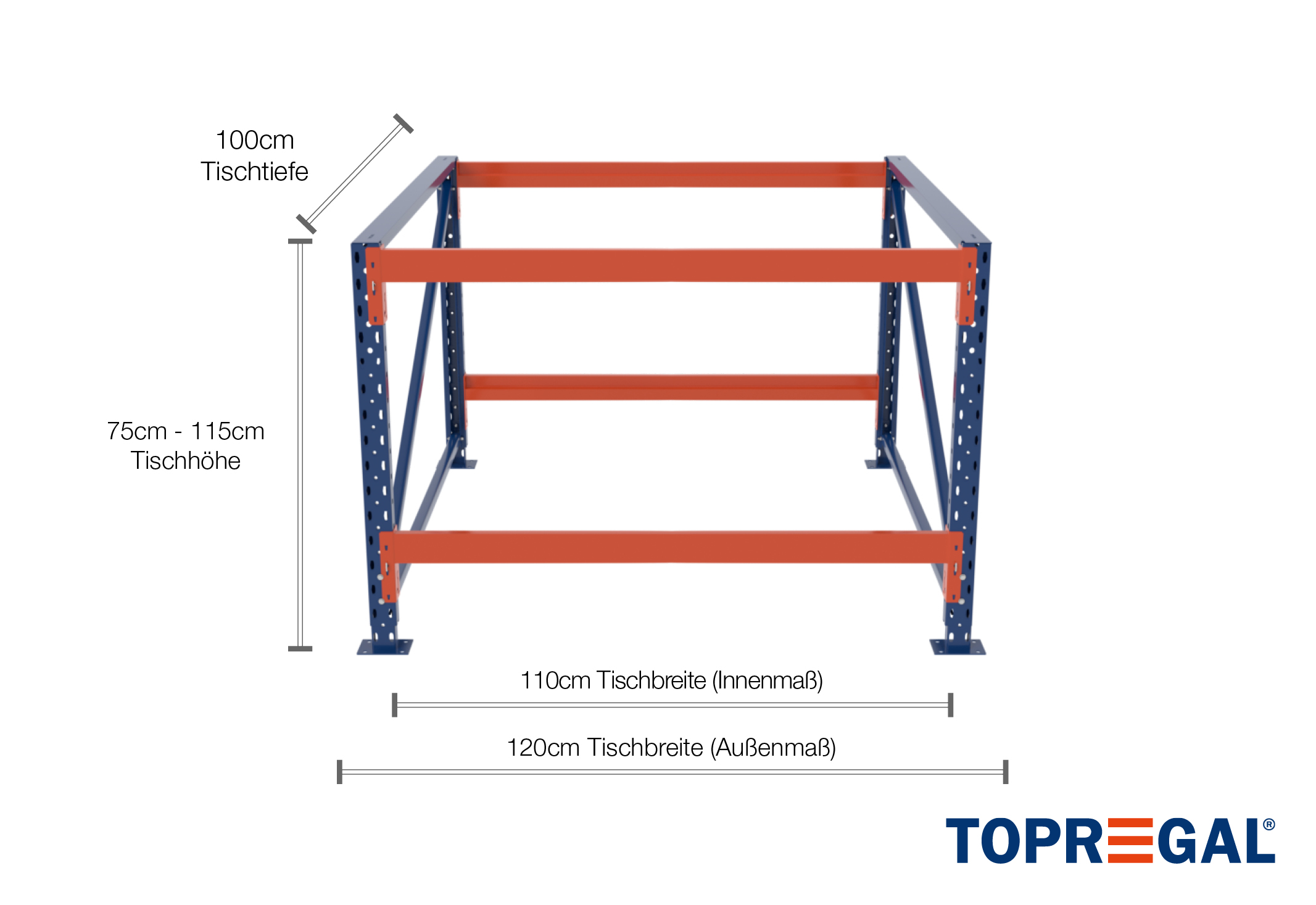 Thanks to the special design of our stepped beams, the optionally inserted rack layers fix themselves in place and are secured against slipping or falling out. These orange painted beams can be attached individually in increments of 50 mm thanks to the plug-in system. The height of the overall table can also be adjusted by up to 40 cm. This means the worktable can be configured to suit your needs.