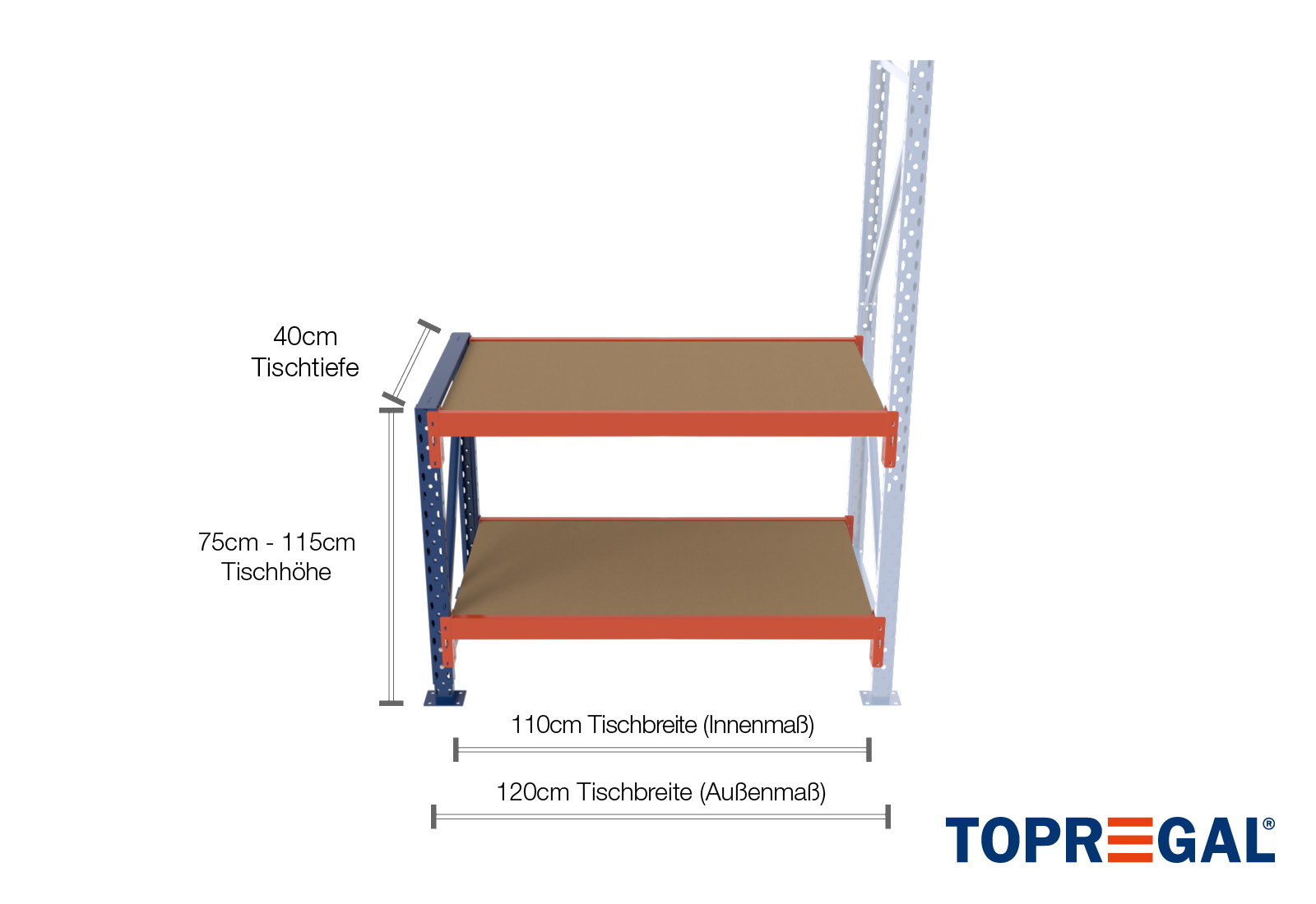 This extension table with compact dimensions of 1,2 m x 40 cm x 0,75 m is an easy way to extend your TOPREGAL storage rack. Thanks to the modular system, you can attach this extension table to any rack type from our storage rack range. This includes our tyre racks, kanban racks, workbenches and much more.