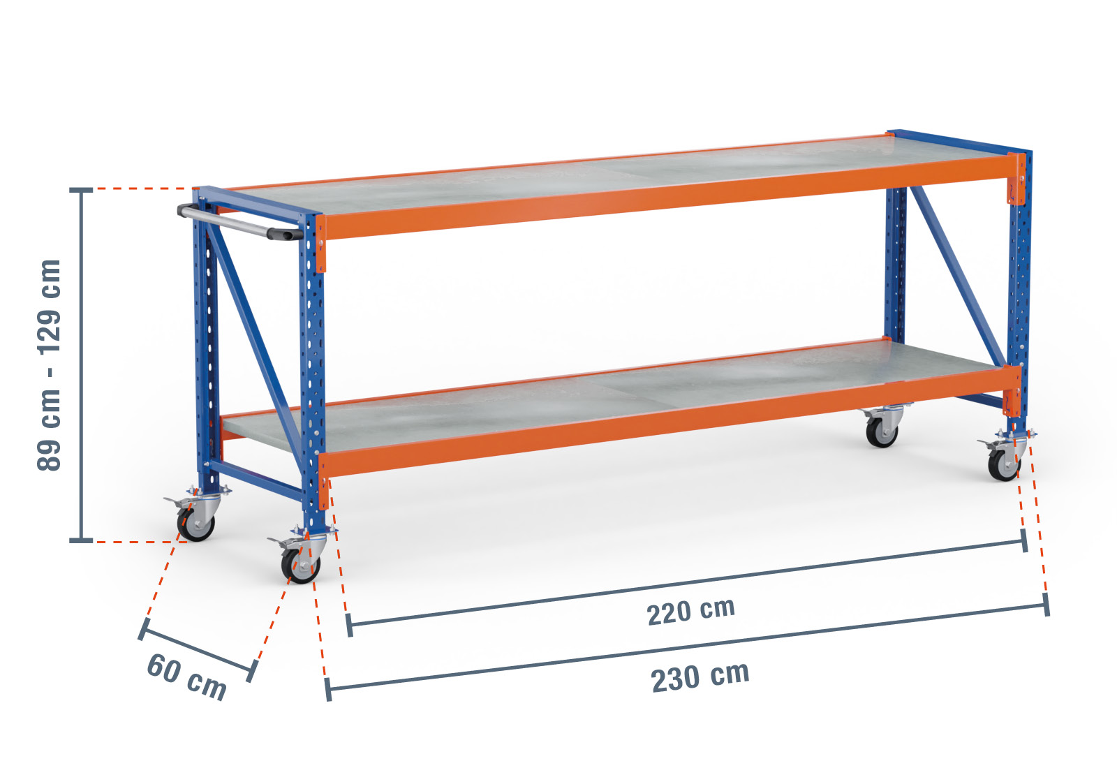 2,3 m mobile worktable MFW1000-AT / 60 cm deep / 890 - 1.290 mm high / 2 levels / rack layer Steel